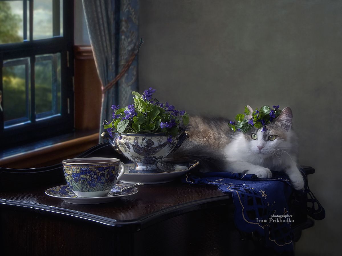 натюрморт, котонатюрморт, постановочное фото, кошка, фиалки, цветы, букеты, Приходько Ирина