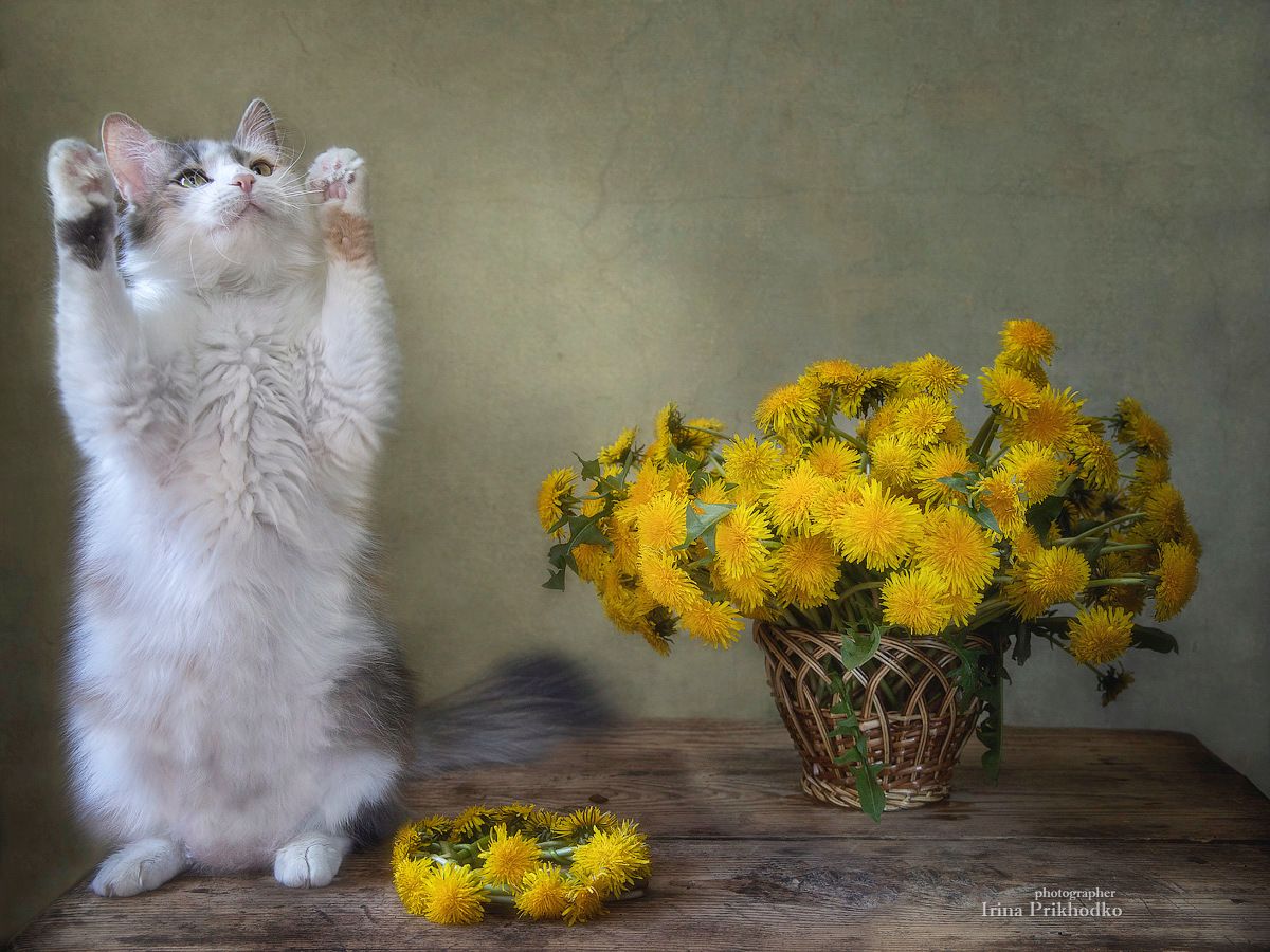 постановочное фото, натюрморт, весна, цветы, одуванчики, кошка, домашние животные, Приходько Ирина