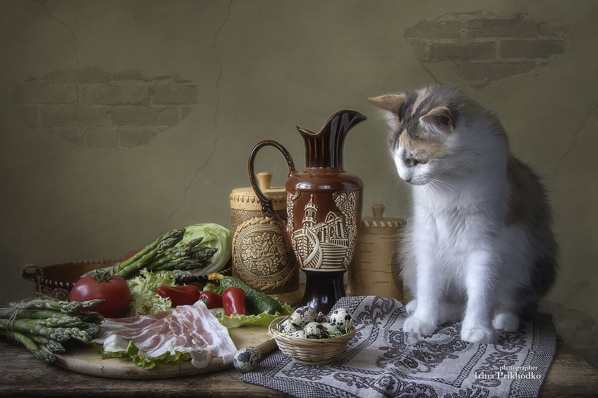 натюрморт, постановочное фото, котонатюрморт, еда, спаржа. бекон, овощи, кошка, Приходько Ирина