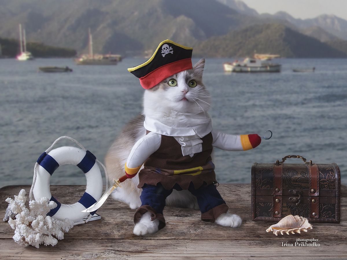 постановочное фото, котонатюрморт, марионетка, пират, кошка, морской берег, Приходько Ирина