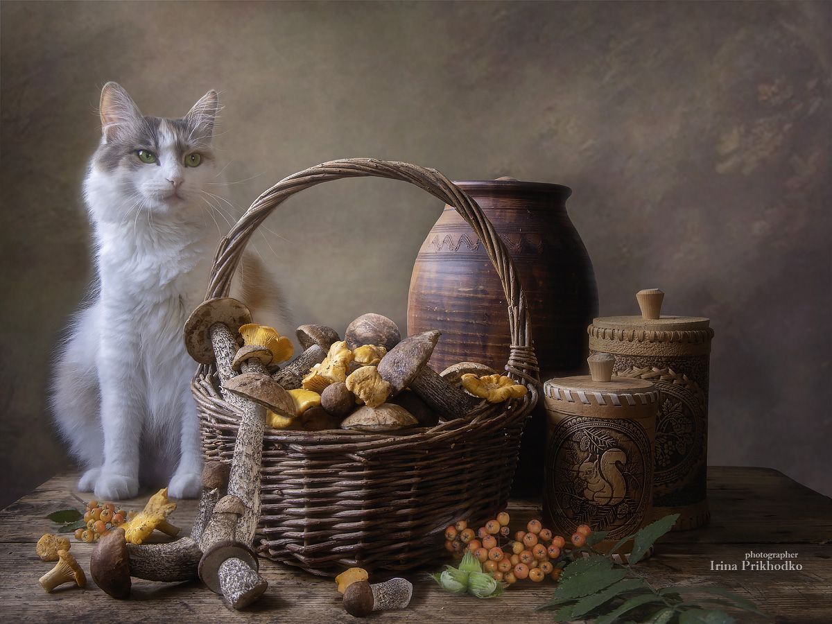 натюрморт, грибы. лето, деревенский стиль, кошка, Приходько Ирина