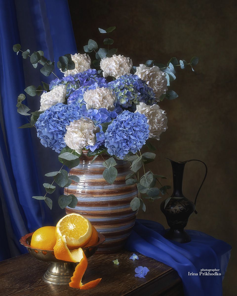 натюрморт, цветы, фрукты, апельсины, гортензии, гвоздики, букеты, Приходько Ирина