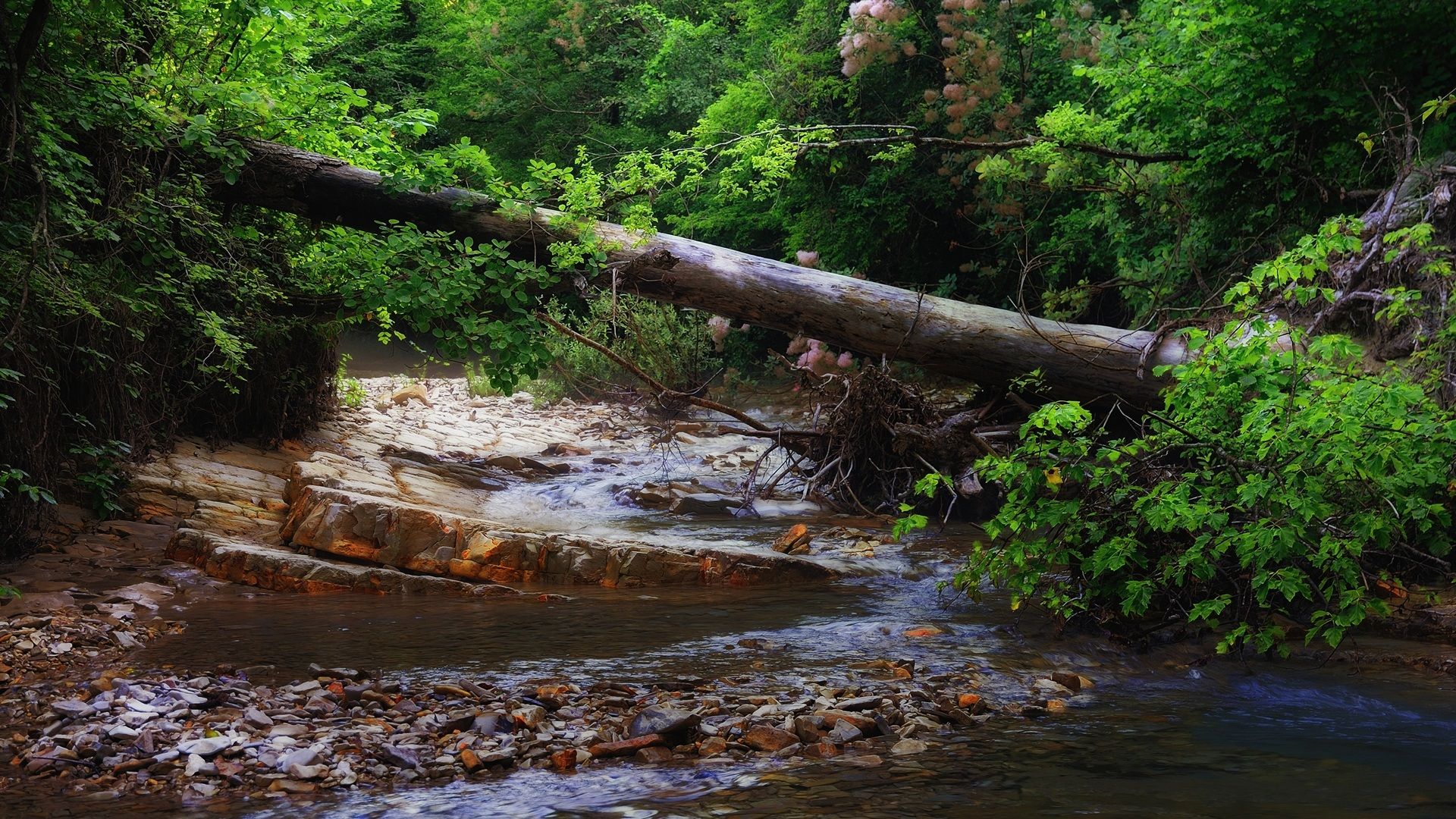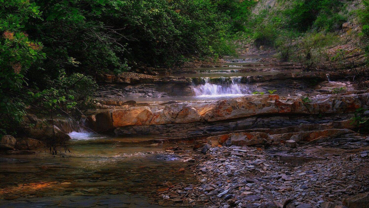 речка скалы лес горы лето природа камни