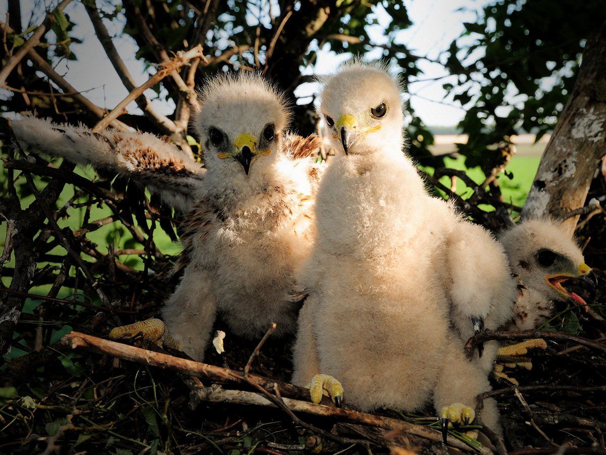 С момента последнего посещения гнезда прошло две недели. За это время птенцы коршуна подросли, на крыльях начало появляться оперение, прорезался голос, клекот стал похож на родительский.