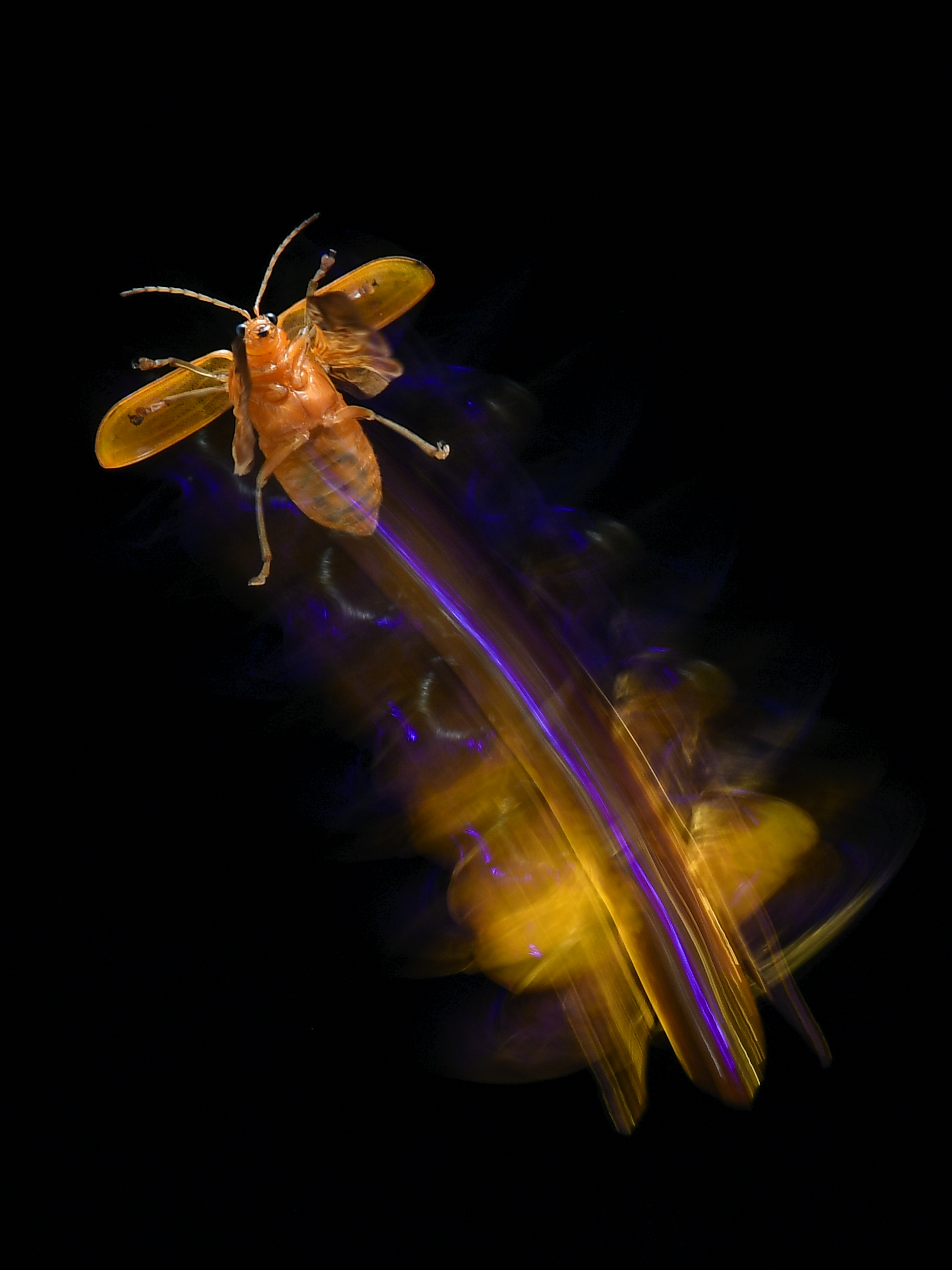Insect in motion, lit by rear-curtain flash, against black. Motion blur trails in warm tones with purple highlights. Clean exposure, controlled light. Not bad. 📸