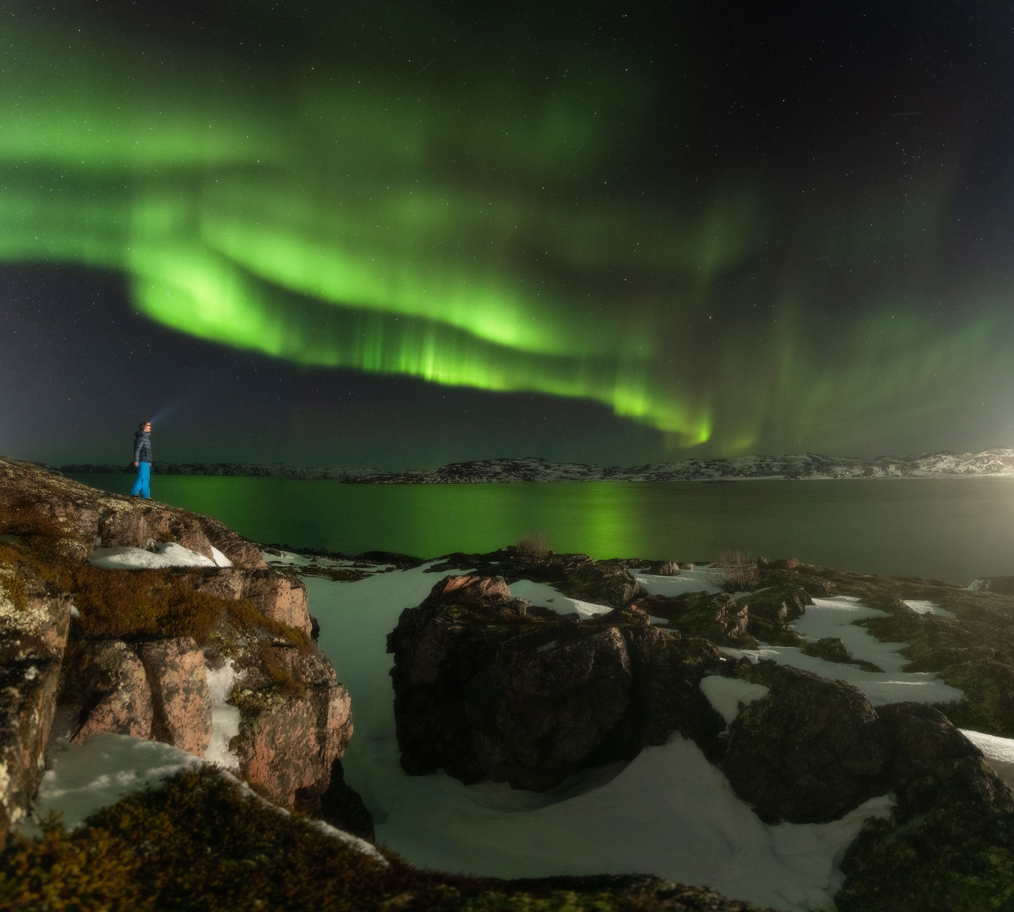 Денис, классный кадр! Зелёная Аврора над водой — это всегда магия. Контраст тёмных скал и яркого неба работает отлично, а человек в кадре добавляет масштаба. Интересно, сколько пришлось ждать этой вспышки? И вообще, на Териберке зимой воздух такой чистый, что звёзды прям близко кажутся.