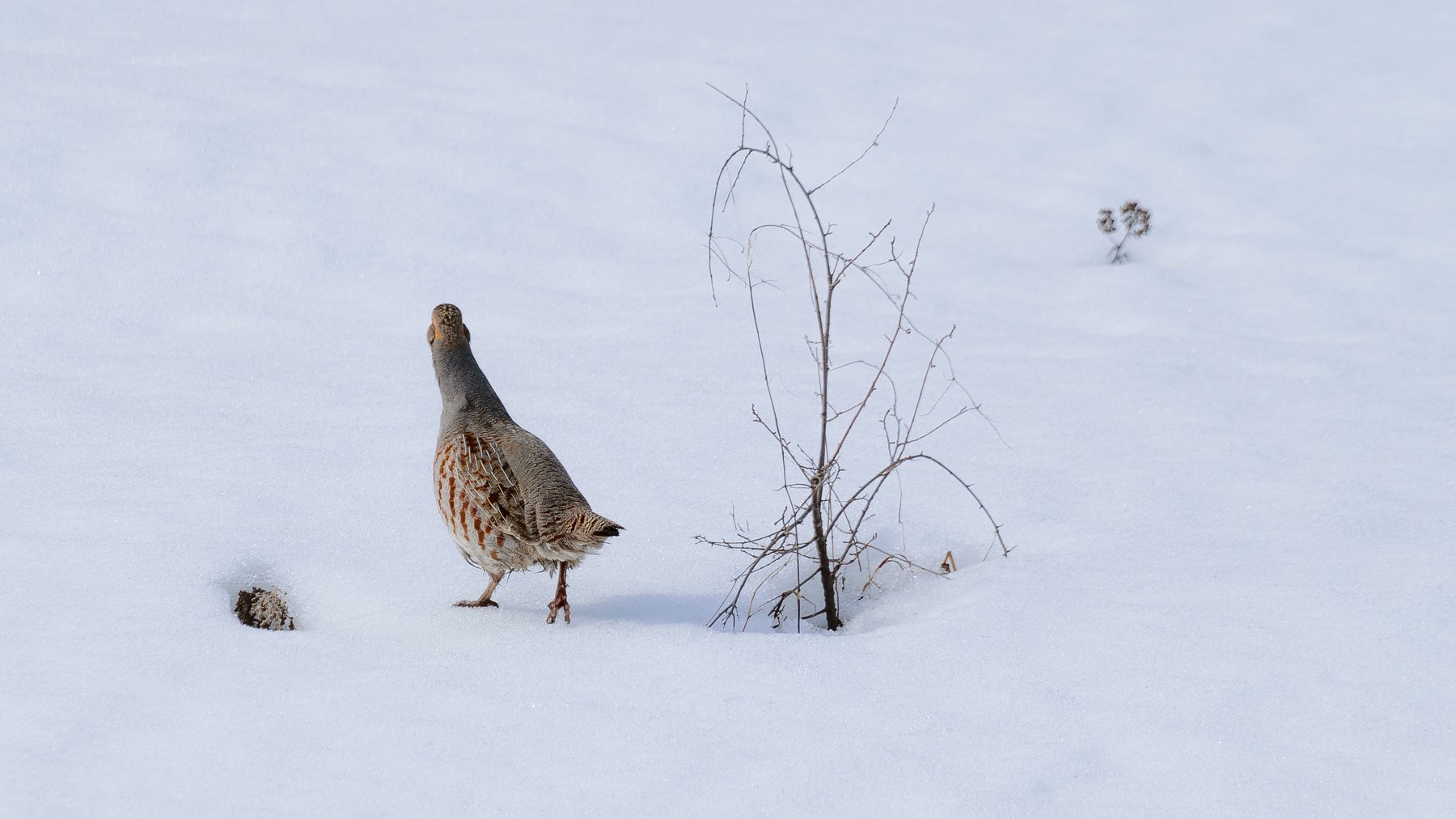 В середине весны, когда в Поволжье еще лежит снег, мне посчастливилось поснимать куропаток прямо недалеко от дороги. Две куропатки очень аккуратно и медленно ходили вдоль лесополосы, выискивая пищу. И вот одну из них мне и удалось заснять.