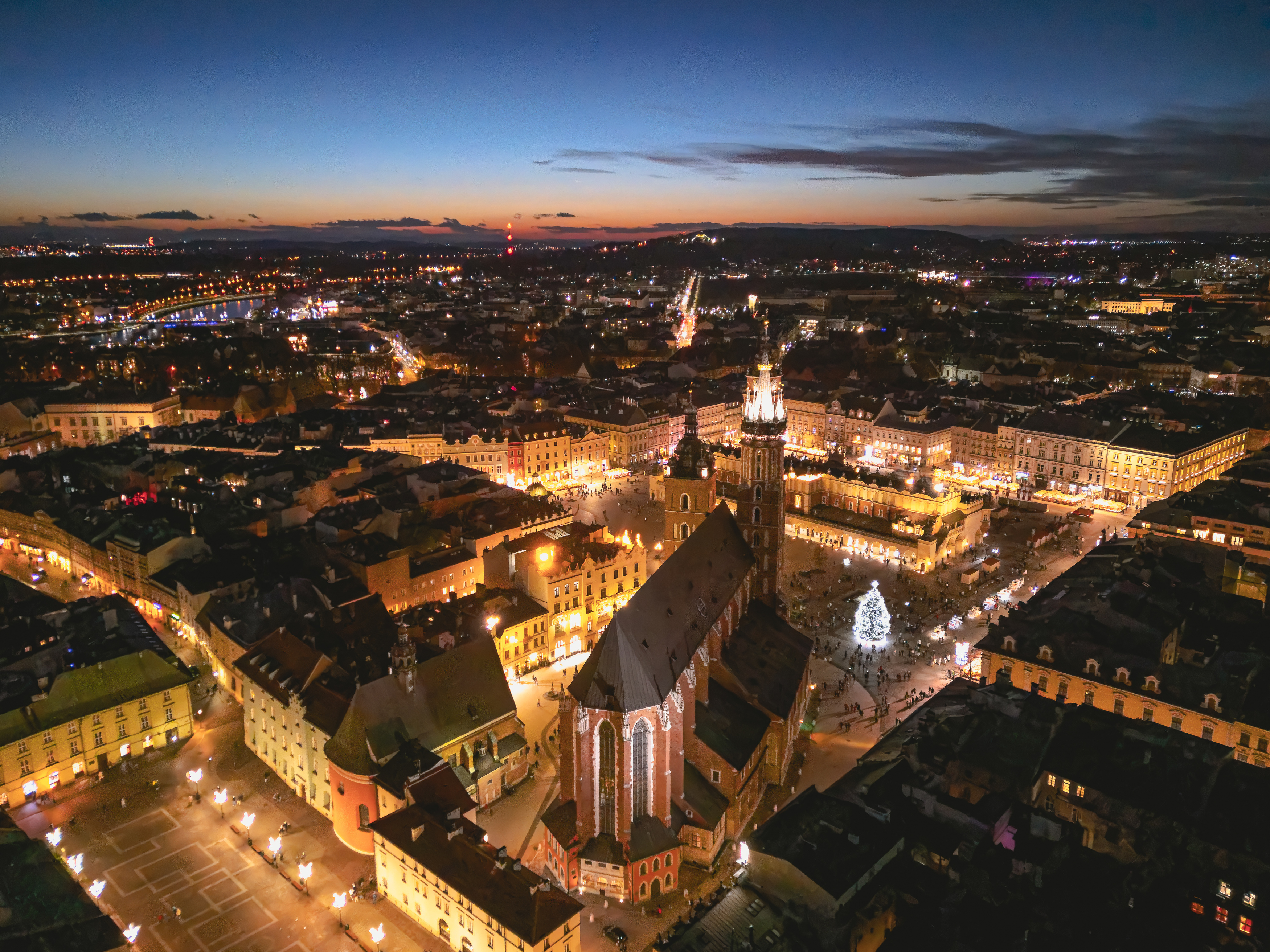 Warm street lighting contrasts with the deepening twilight, drawing focus to the central square and the illuminated church. The composition is balanced, but the horizon line could be cleaner to reduce visual clutter.