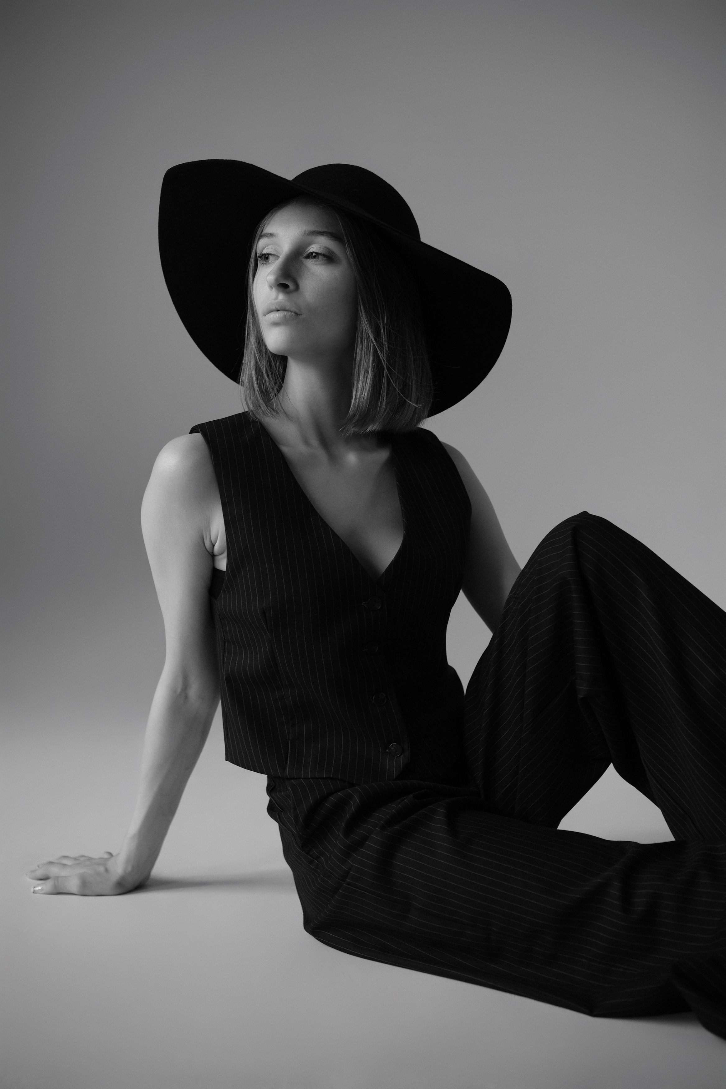 Классная работа, Александр. Монотонность кадра — не слабость, а сила: чёрный костюм, широкая шляпа, поза — всё это создаёт ощущение тишины и внутреннего напряжения. Свет мягкий, но чёткий, акцент на лице и линиях тела — хорошо посчитано. И да, этот взгляд... он не смотрит в камеру, а где-то за неё. Очень живо. 👏