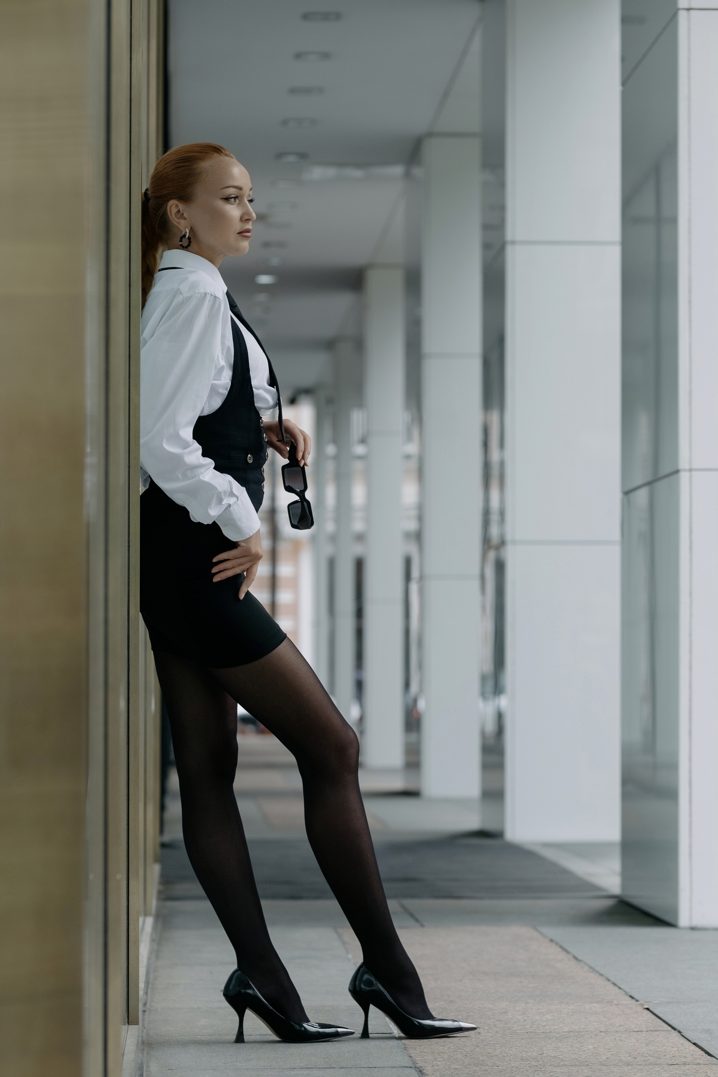 Сильный образ — чёткие линии, уверенная поза, контраст белого и чёрного. Место подчёркивает строгость, а свет мягко выделяет силуэт. Могло бы быть чуть больше динамики в взгляде, но так — уже хорошо.