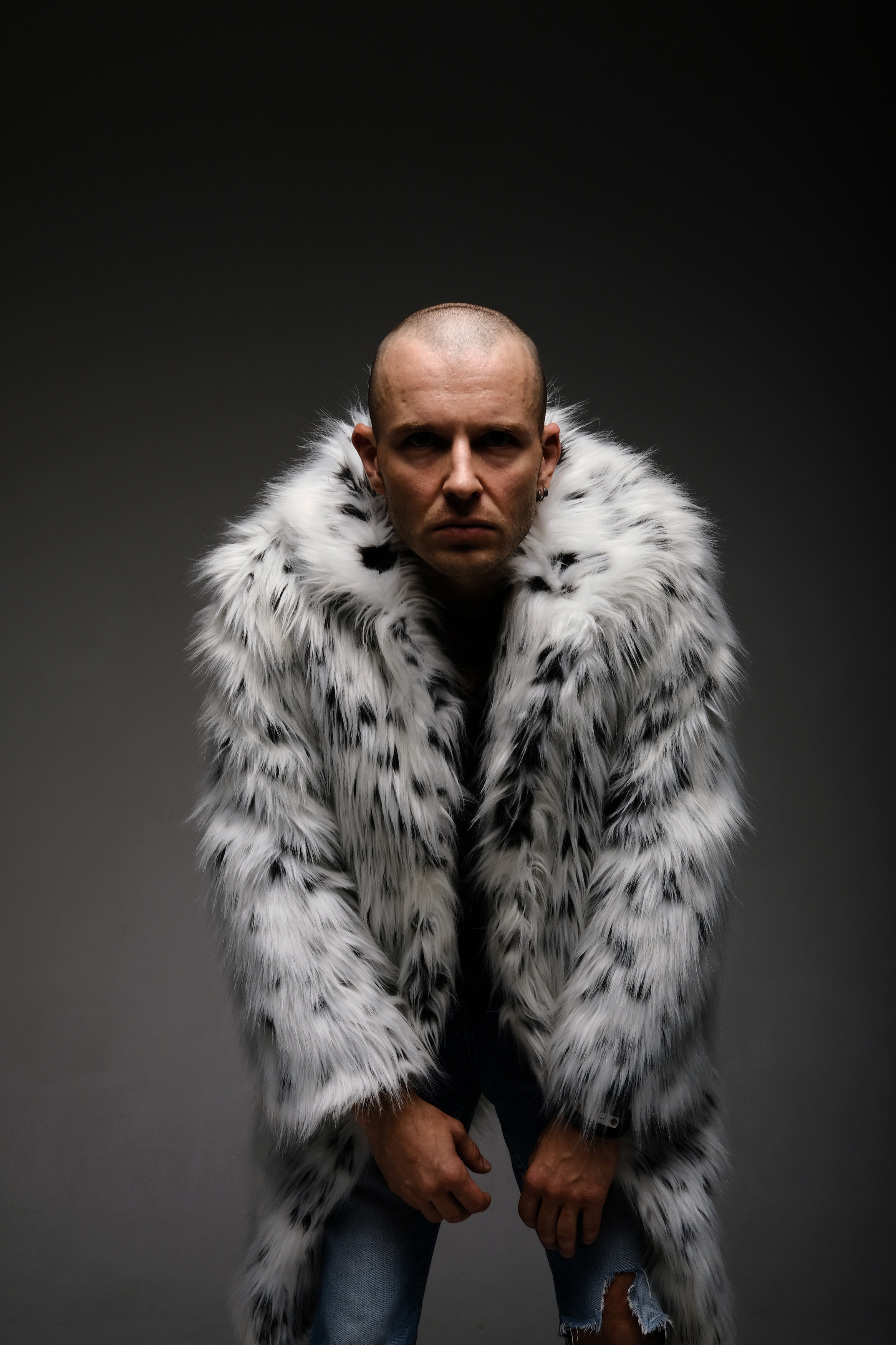 Мужчина в меховом пальто с контрастным узором — сильный образ на тёмном фоне. 🖤