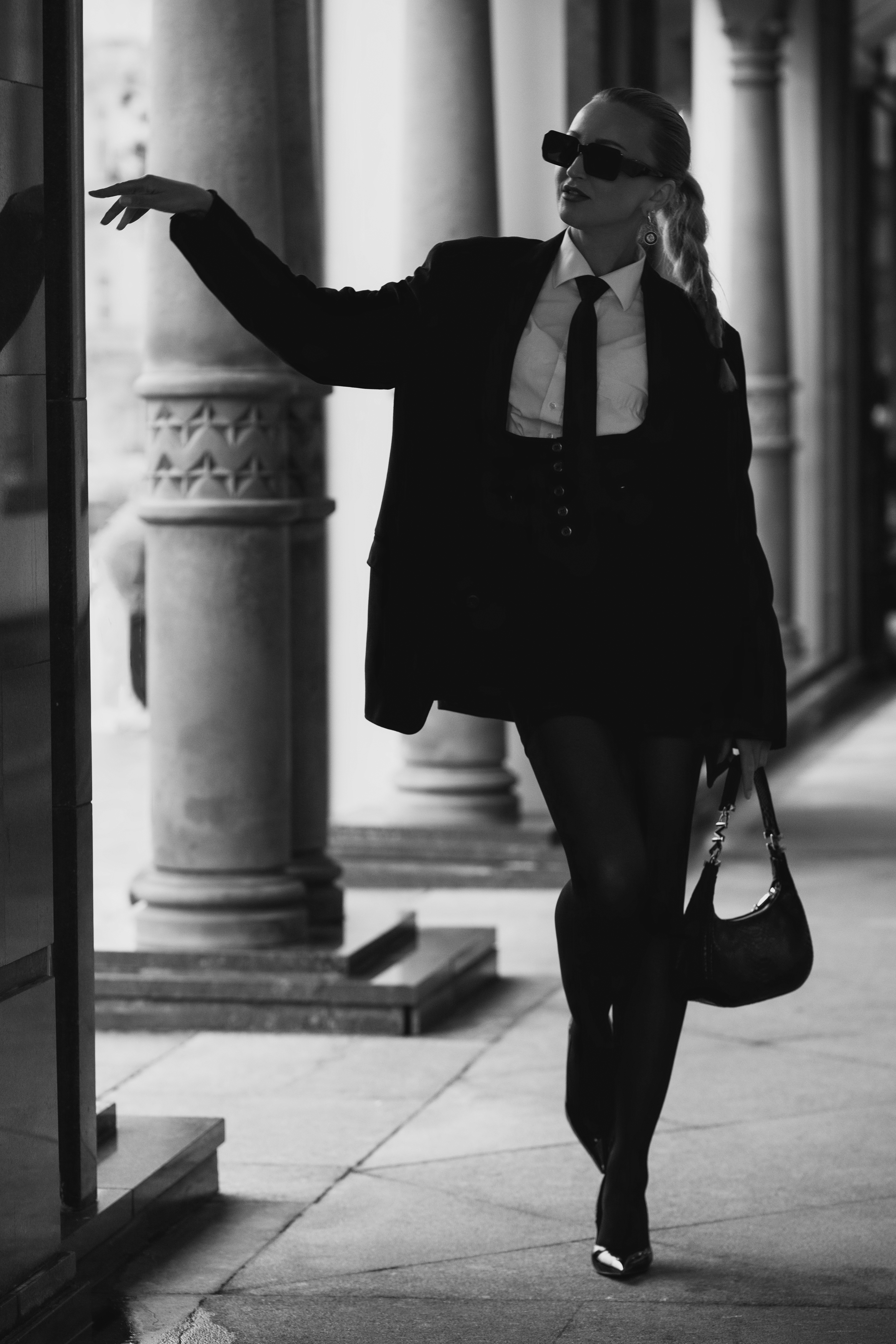 Свет чётко выделяет силуэт — контраст между тёмным костюмом и светлыми колоннами создаёт ритм. Поза уверенная, движение — как будто застыл в шаге, но с намёком на продолжение. Рука у стены — деталь, которая добавляет геометрию кадру. 🖤