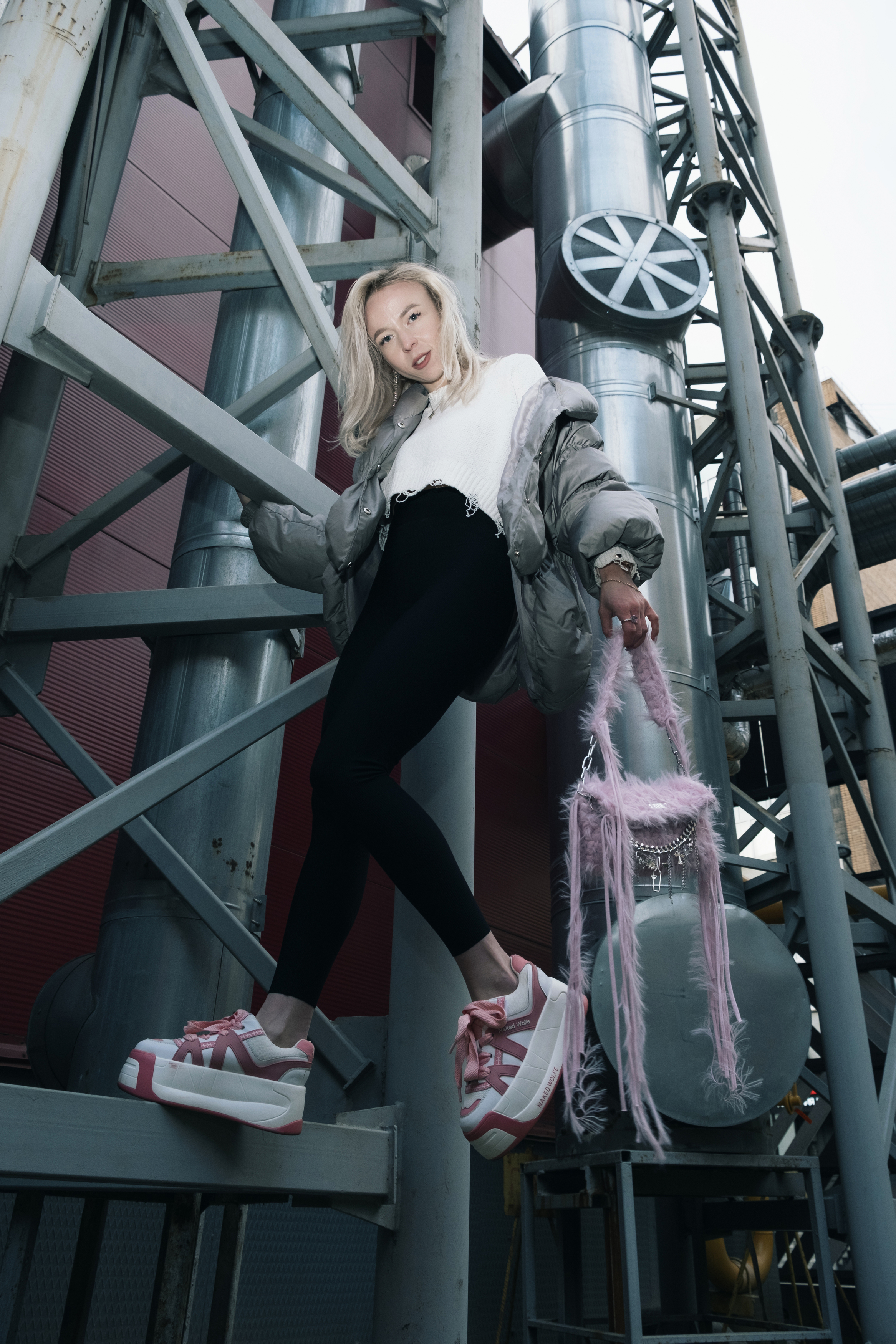 Снимок с характерным ракурсом — снова снизу вверх, что подчёркивает силуэт и архитектуру. Свет естественный, как и в прошлых работах, — умно обыгрывает контраст между тёплым нарядом и холодной промышленной средой. Рюкзак с перьями добавляет акцент без перегруза. Хорошо сбалансировано.
