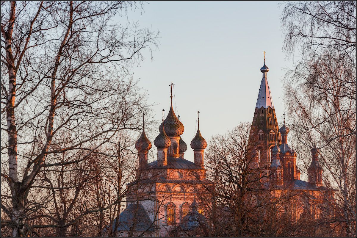 На переднем плане - дома деревни Березники, а на заднем плане храмовый комплекс церквей Усекновения главы Иоанна Предтечи и Вознесения Господня в селе Парское.