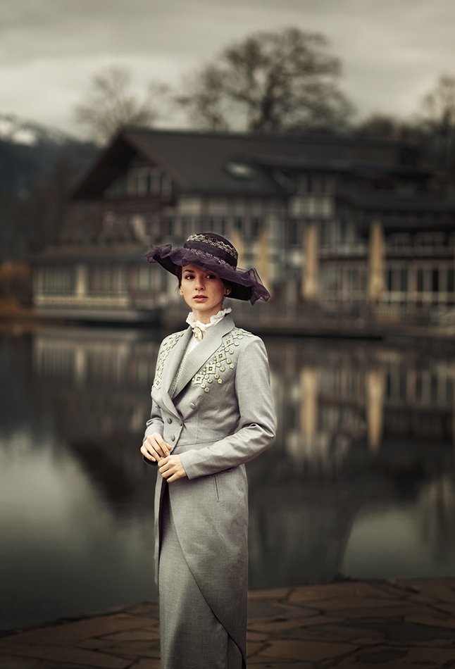 На снимке — женщина в классическом наряде начала XX века, стоящая на берегу пруда перед старинным домом. Серое платье с вышивкой, высокий воротник и широкополая шляпа создают образ из эпохи викторианской элегантности. Отражение в воде усиливает ощущение тишины и уединения. Фотография передаёт атмосферу ностальгии, будто время остановилось. Работа DesiArt Kuleshova — это гармония стиля, природы и человеческого образа.