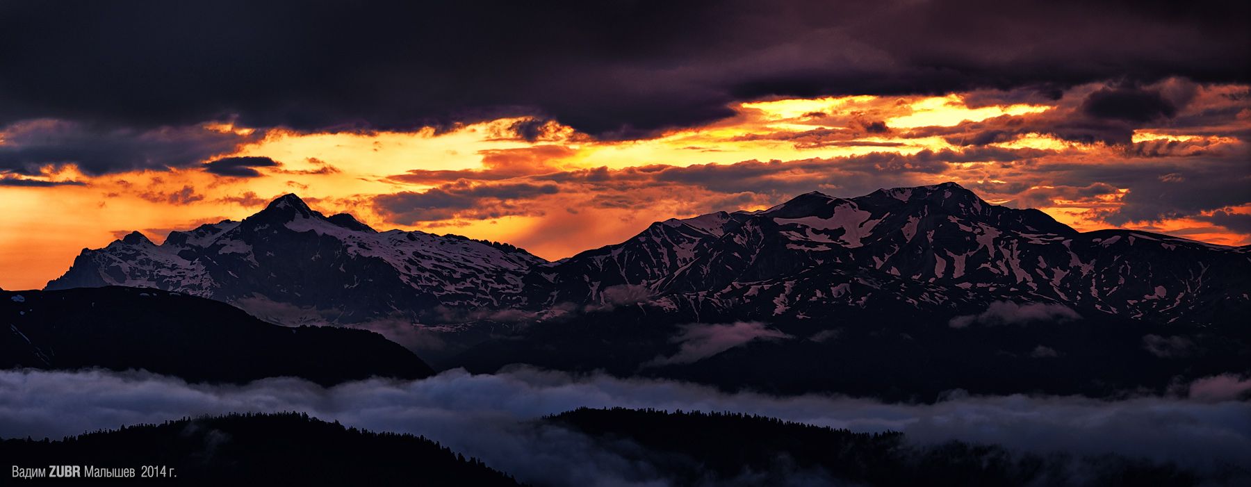Внезапно вечером сплошная пелена облаков треснула. Плотные сгустки стали растягиваться и в образовавшиеся разрывы хлынул золотой закатный свет. Буквально за несколько минут картина полностью преобразилась. Побросав палатки, схватив камеры, кто в чем был, мы бегом рванули к вершине ближайшего холма. Почти босиком, с насквозь мокрыми ногами высунув языки мы добрались до видовой площадки откуда открывался вид на удивительную игру света и облаков. Все закончилось так же стремительно как и началось, солнце село в предгорьях и накатилась ночь. Майские грозы на высокогорном пастбище Абаго. Кавказский Биосферный заповедник. Западный Кавказ. (однорядные панорамы "с рук")