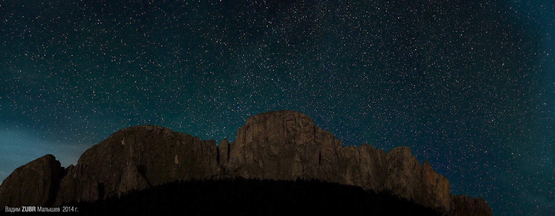 Панорамная съемка в 5 фрагментов каждый из 2х кадров. Снято в августе в природном парке Большой Тхач, ночью дул сильный, порывистый ветер, который раскачивал камеру даже на штативе поставленном в самое широкое положение. На противовес штатива был повешен мешок со всем запасом провианта группы, что вызвало немало вопросов, куда это я со всей едой в ночь иду. Скалы подсвечиваются луной прикрытой облаками. (объектив nikkor 58 mm )