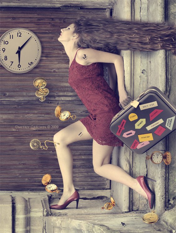 абсолютно не вяжется с торопыжством чемодан с наклейками, навевающими мысли о спокойном и безмятежном отдыхе в разных концах света, волосы выглядят не развевающимися, а прищемленными дверью, профиль - не самая сильная поза для этой модели, падающие хронометры ничего не добавляют раскрытию идеи снимка, а цветовое решение и кадрирование очень спорны...