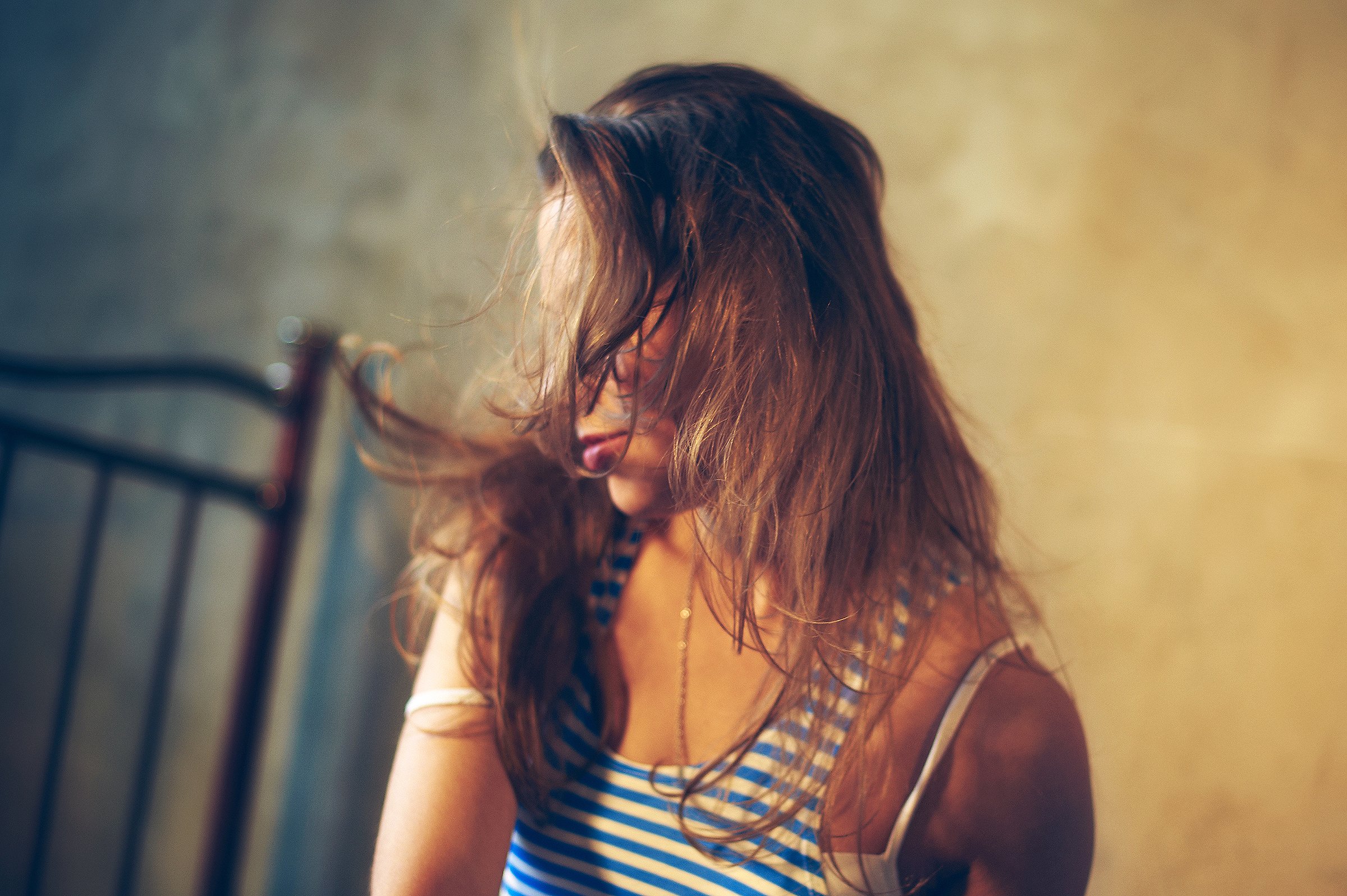 девушка, комната, волосы, кровать, тельняжка, Дмитрий