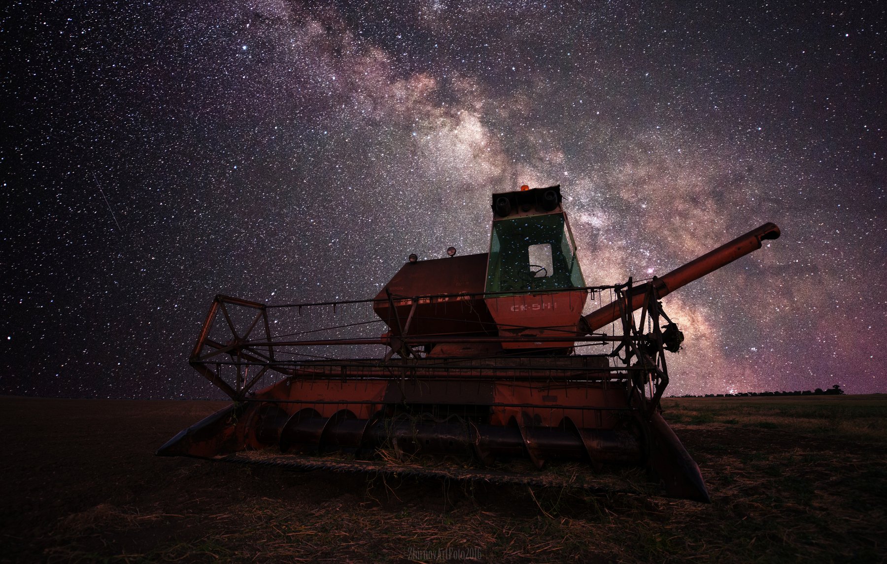 Млечный Путь светит ярко над собранными полями пшеницы,со спящем трудягой комбайном Нива в западной части Крыма,куда не доходит свет городов.