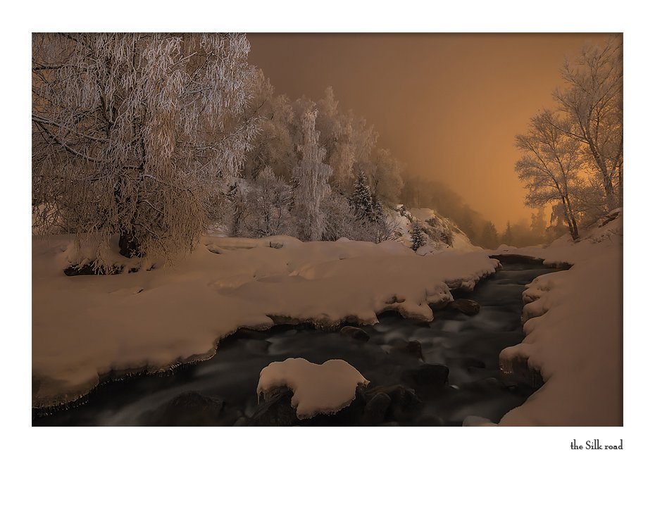 Редкий снимок в том, что изморозь, много снега и течет река. Немного непонятен свет - то ли режимный свет, то ли свет города. Но снимок все равно хорош!