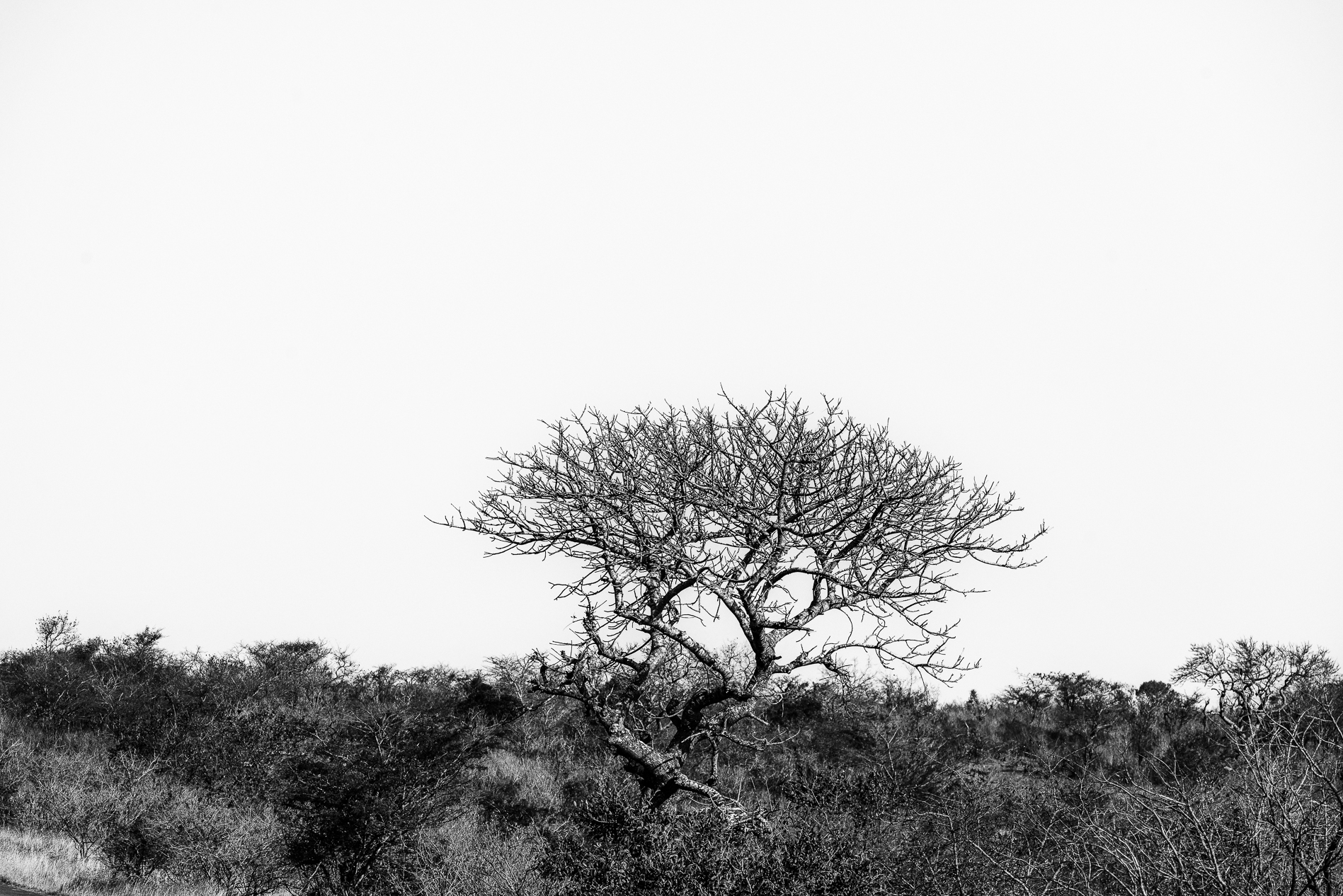 In this series, solitary trees rise from the vast landscapes of the Imfolozi wilderness, their silhouettes etched in monochrome. Each image captures a moment of stillness in the South African bush, where isolation becomes form, and form becomes memory.