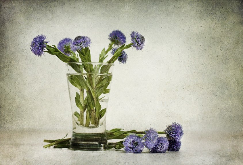 Несколько равнозначное построение композиции за счёт, видимо, сходного количества цветов в стакане и на поверхности... Их бы внизу освободить, разбросать... Но сама идея хороша... :)