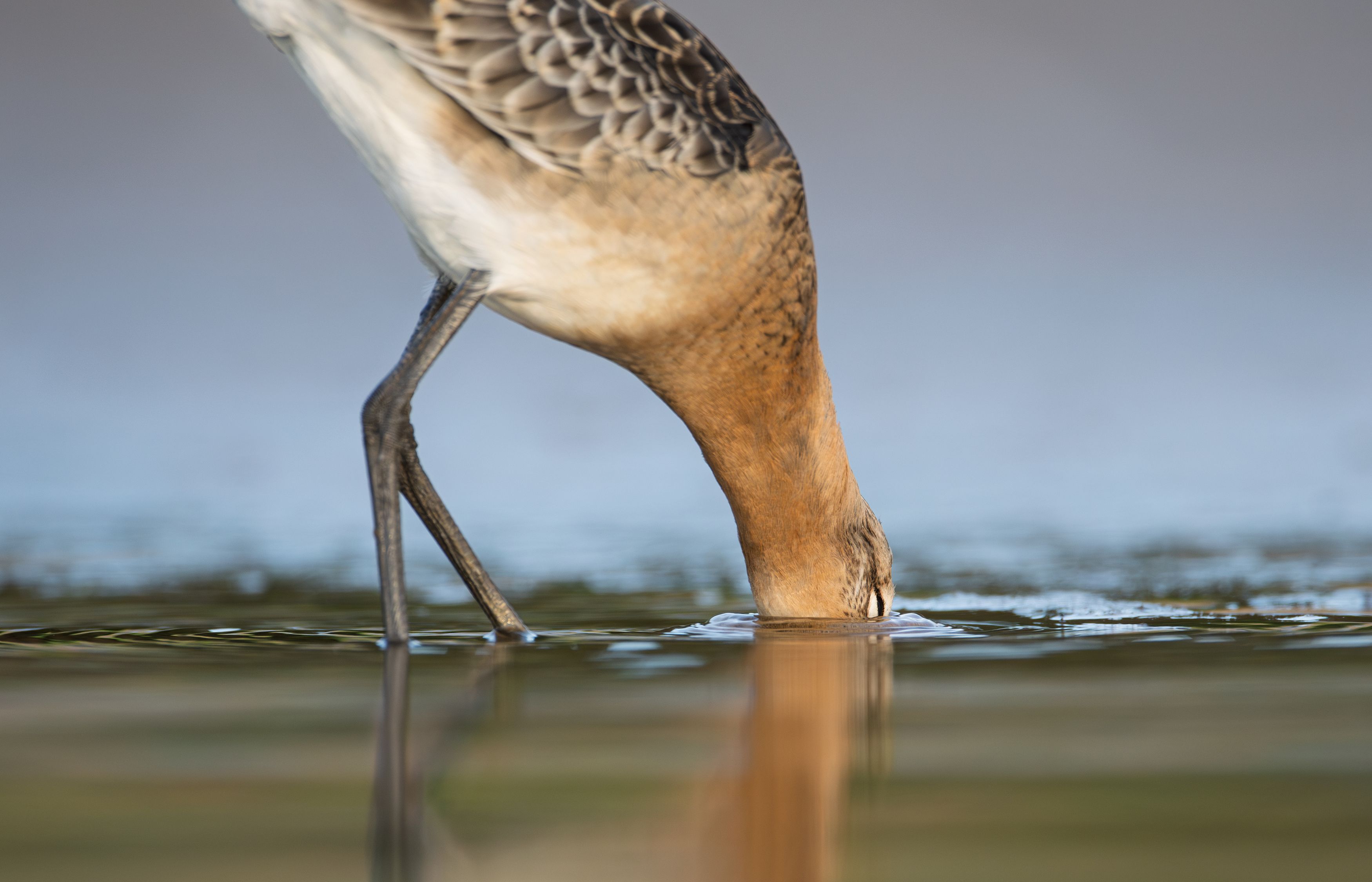 Фото выразительное — резкий фокус на шее и голове птицы, удачный момент погружения в воду. Композиция проста, но работает. Легкое размытие фона помогает выделить объект.