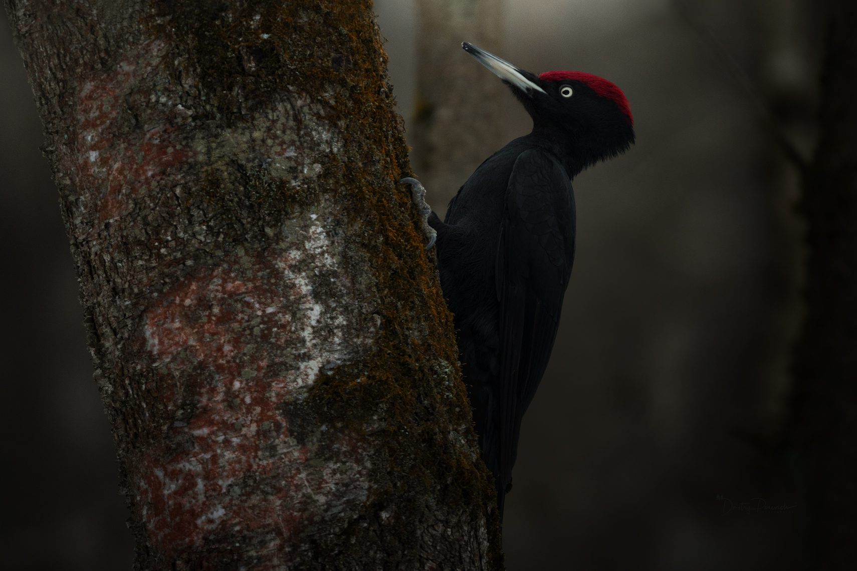 Чёрный дятел на стволе — сдержанно, но с выразительностью. Тёмный силуэт на фоне мха и коры, красный шапочкой — как акцент в тишине леса. Свет мягко подчёркивает контуры, птица кажется вдумчивой, почти задумчивой. 🖤🦉