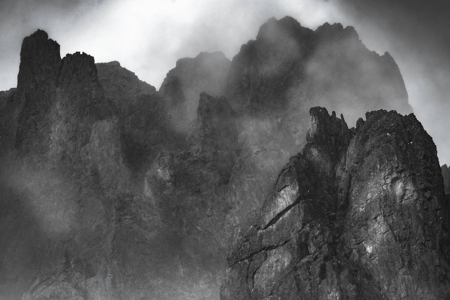 Туманные скалистые вершины Заилийского Алатау сразу после снегопада, Алматы, Казахстан, 2025.