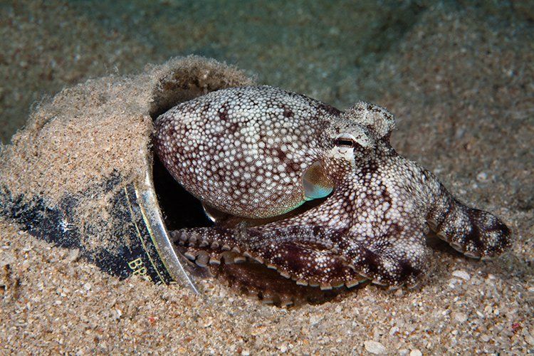 м-м-м, мне не нравится снимать с таких расстояний, с трех метров в воде он уже будет не осьминогом, а скучной, тусклой, серо-зеленой фигней, этот кадр снят с расстояния чуть больше метра