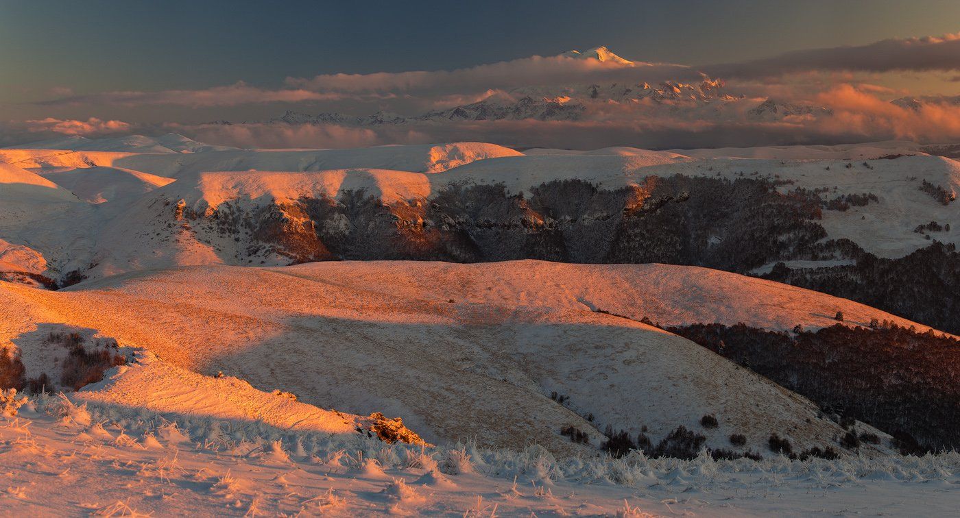 Совершенно нереальный розовато желтый свет появился внезапно, как по команде и, как всегда, неожиданно в тот момент когда Солнце коснулось линии горизонта где-то над укрытыми недавно выпавшим ослепительно белым снегом горами Домбая. Рельеф окружающих нас со всех сторон гор мгновенно изменился, появился объем. Буквально через 5 минут розовый свет пропал, Солнце скрылось и горы начали погружаться в сон.