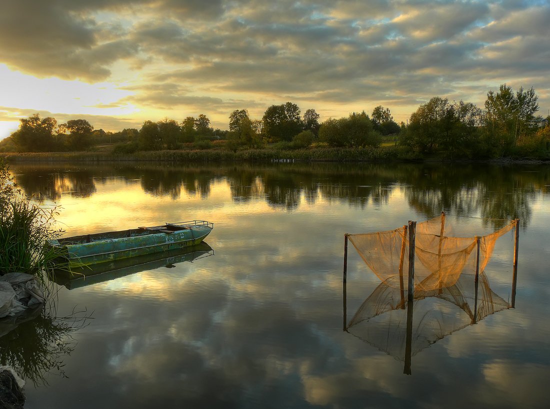 пейзаж, пруд, лодка, сетка, облака, DAN