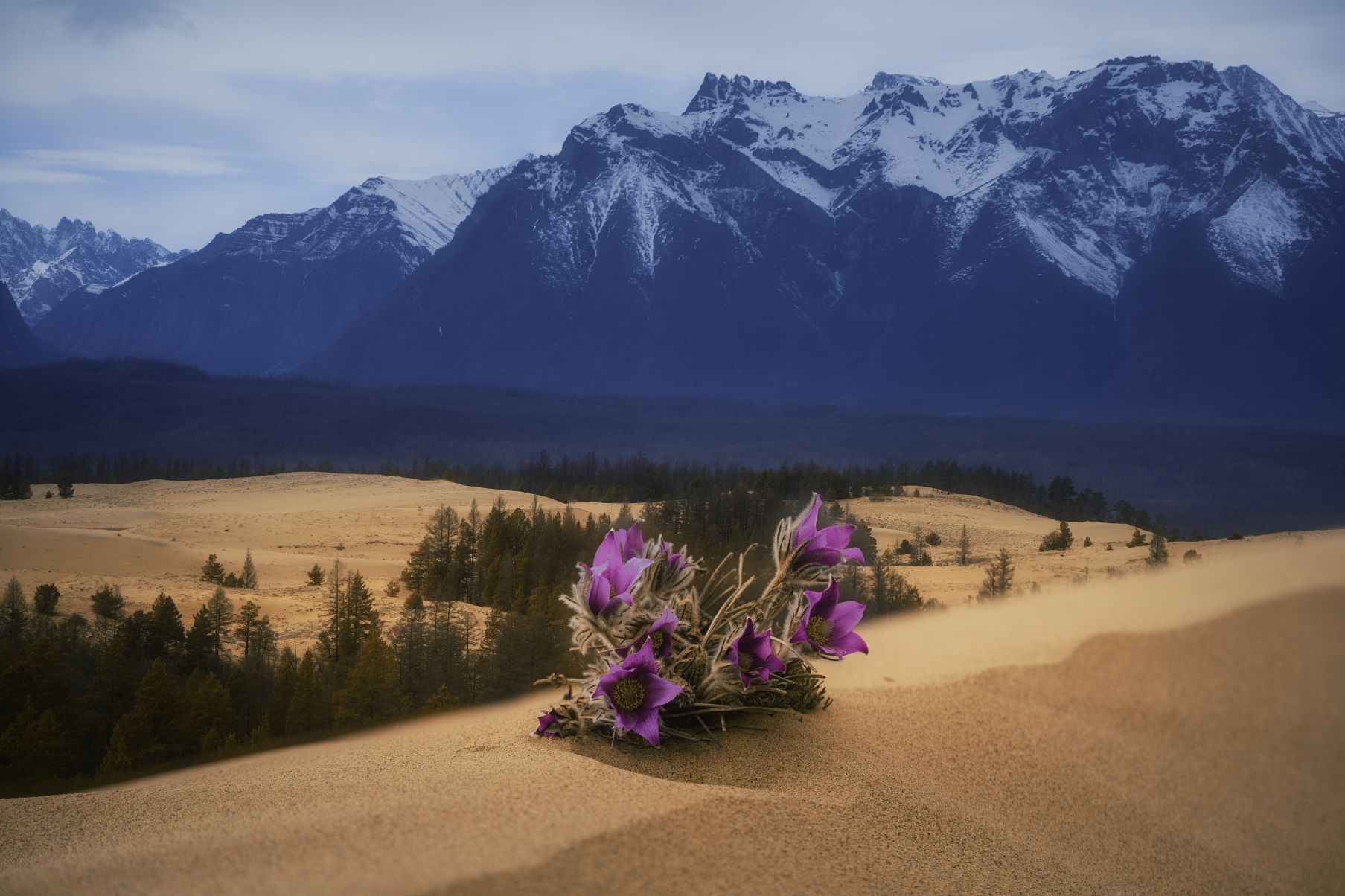 Был сильный ветер, который буквально сбивал с ног, песок проникал буквально повсюду. Каким образом удается выживать этому цветку непонятно. Так всё -таки Выживший, или Царь горы? Забайкальский край. Чарские пески. 9 мая 2024