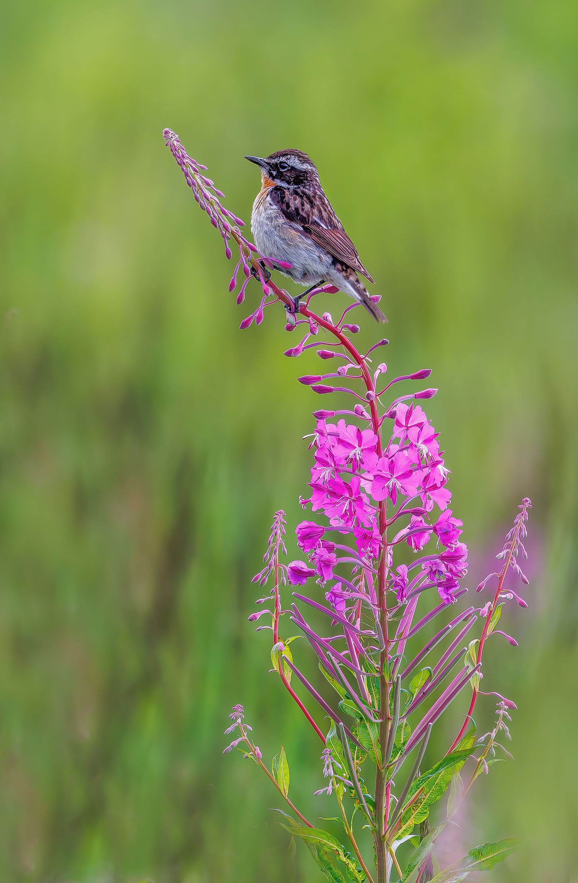 Вы сняли птицу на фоне ярко-розового цветка — чётко, с акцентом на детали оперения и позу. Композиция выверена: птица в фокусе, фон мягко размыт, цвета контрастны, но не перегружены. Хорошее освещение, естественная поза — снимок передаёт момент живой природы.