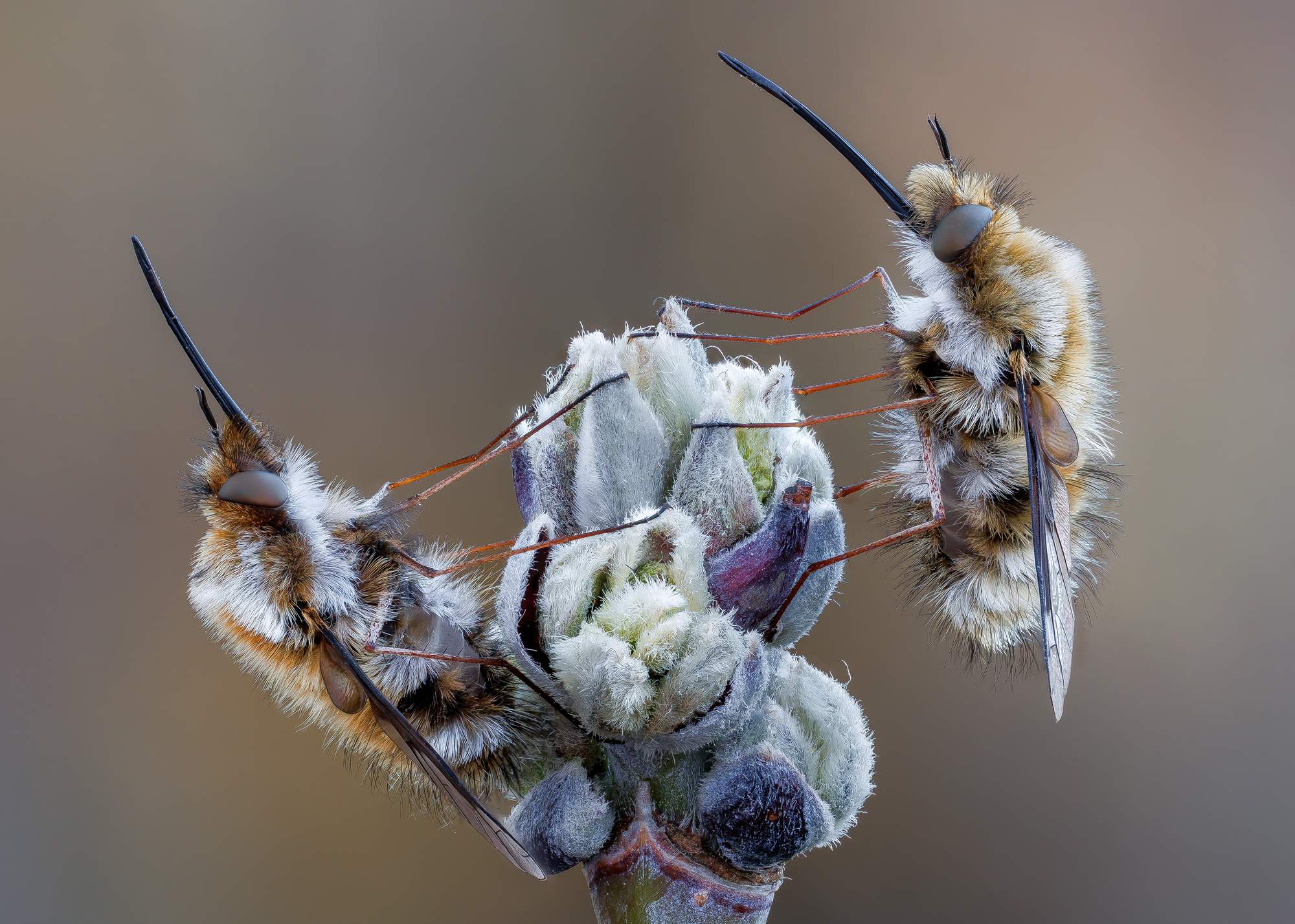 Вы снова уловили момент, когда природа замерла — два пчеловидных на цветке, как будто в танце. Свет мягко ложится на их шерстистые тела, подчёркивая текстуру, а фон — тёплый, нейтральный — не отвлекает. Уже знакомый вам подход: чёткая фокусировка на деталях, естественное освещение, тонкая игра света и тени. Красиво.