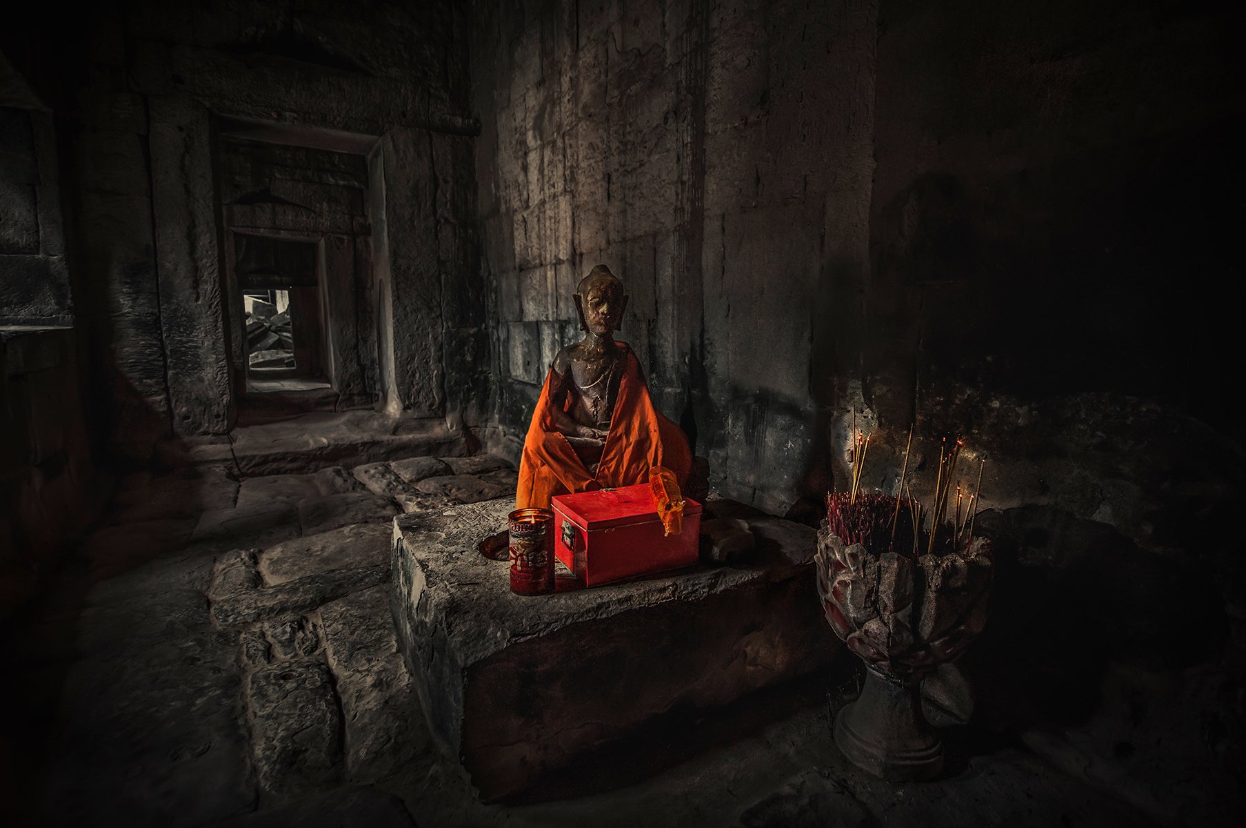 Такие действующие алтари встречаются во многих закоулках Ангкор Вата. Рядом с ними хорошо посидеть, отрешиться от суеты - благо дело никто не заходит, только иногда монахи. Они - народ очень доброжелательный. Ни в коем случае не требуют donation, в отличие от Тая. Хочешь поставить местный аналог свечи - пожалуйста, хочешь посидеть - конечно.