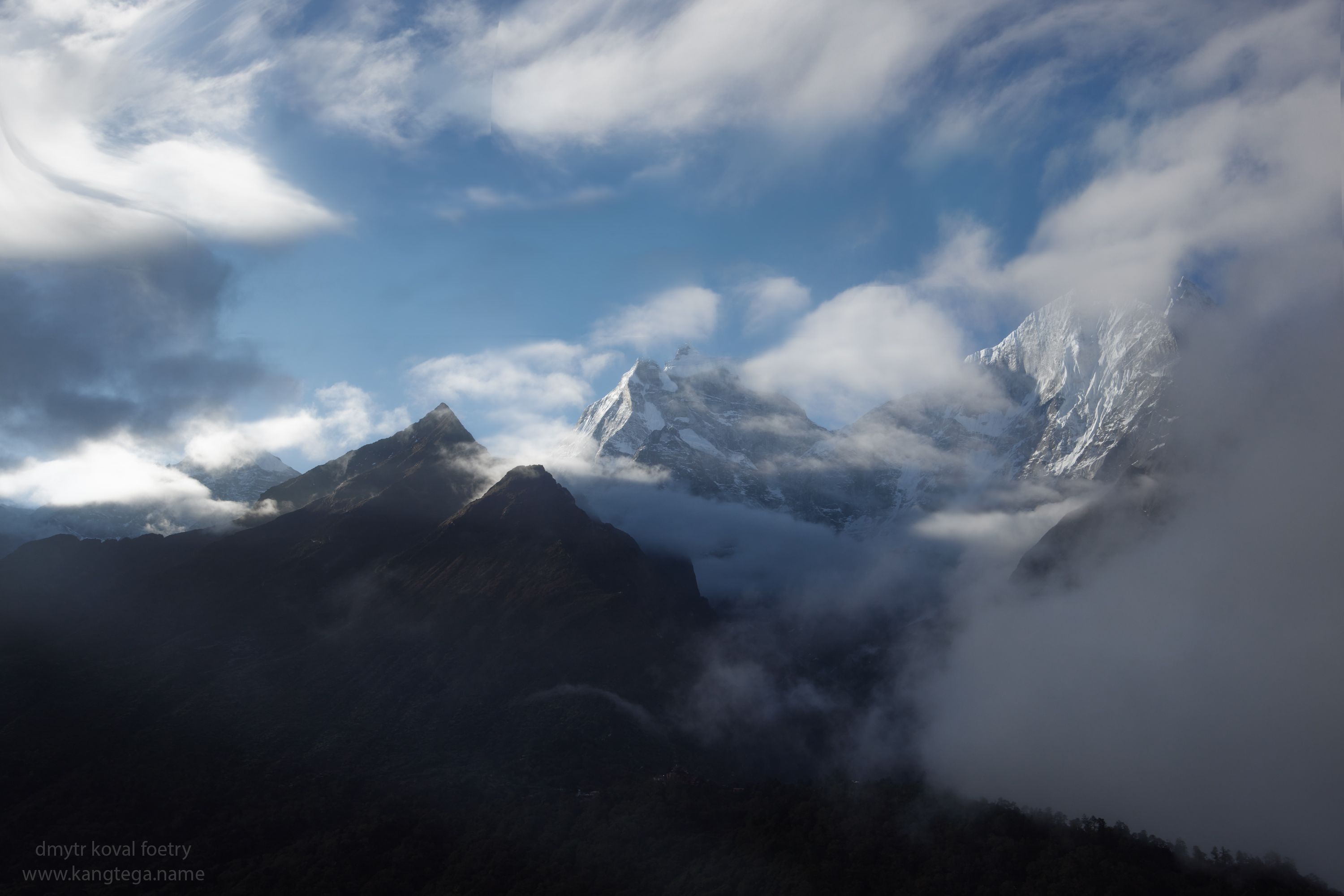 Рассветный вид на Кангтэгу 6 782 м. над уровнем манаса (ума), и на Тенгбоче гомбу внизу 3880 м.