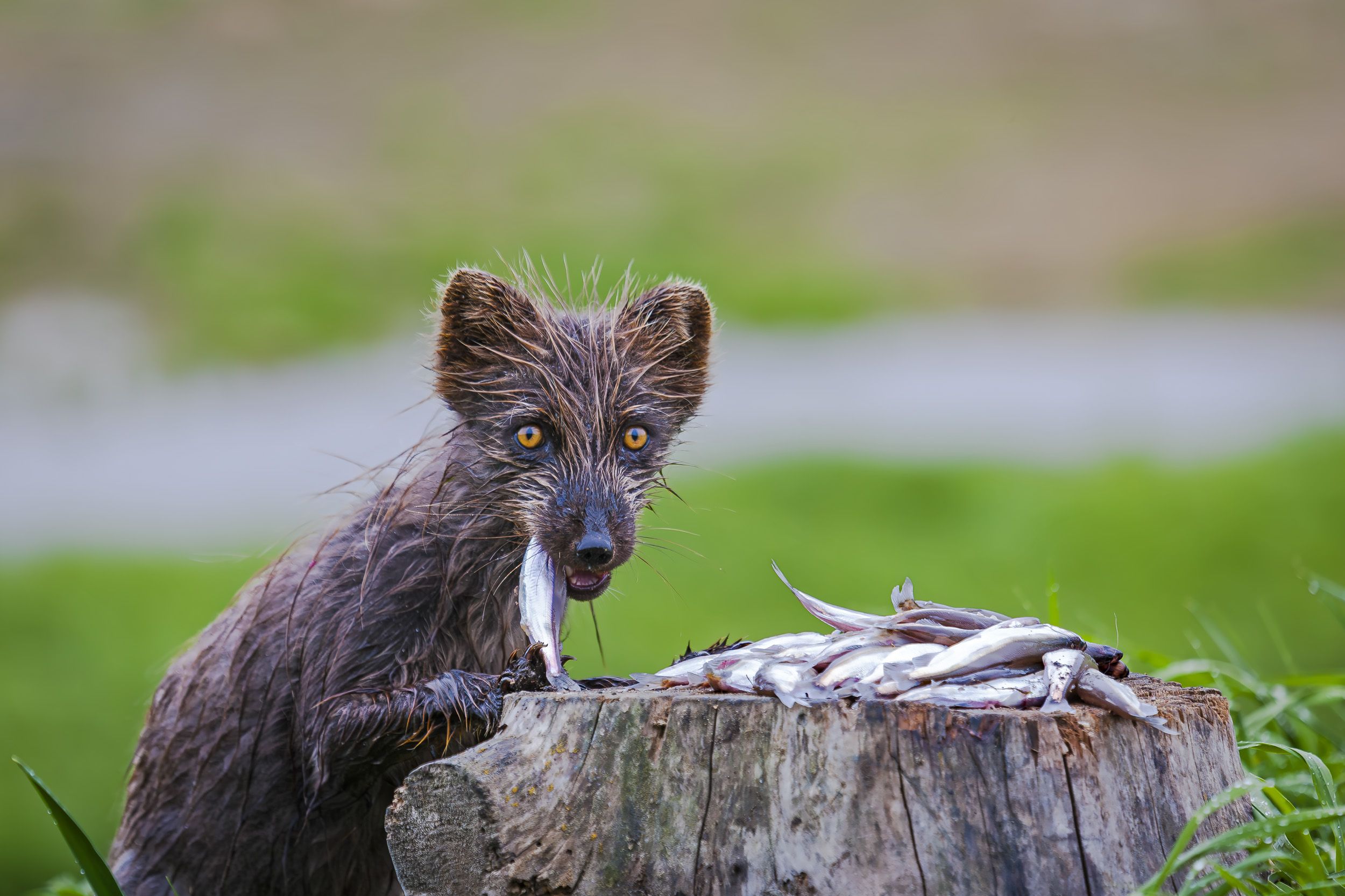 Знакомы вам вот такие слова как: косохлёст, мжица, дряпня, лепень, халепа, ситник, бус? Я тоже не знал этих слов пока не поинтересовался значением слова бус, которым жители Командорских островов называют мелкую дождевую пыль. Обычно она, пыль эта, частенько бывает на острове Беринга осенью и в начале лета. А в начале лета, в первых числах июня, на острове происходит нерест мойвы, её называют здесь уёк. И утром, местами, на берегу можно обнаружить скопление этих рыбёшек, не успевших скатиться в океан. После голодной зимы вся островная живность в виде чаек и песцов начинает пировать. Успел сделать несколько кадров песцов, заглатывающих рыбёшек с прилипшей к чешуе галькой . Я тоже набрал себе на завтрак, промокнув под этим самым бусом - выскочил в одной футболке, пару сковородок пожарил, а оставшееся выложил на пенёк. Не зря выложил. Из мокрой травы, после временами накатывавшегося буса, вынырнула вся мокрая молодая беременная самочка песца и давай чавкать - на берегу ей, видимо, не досталась своя часть завтрака, чайки они прожорливые и шустрые, мгновенно подбирают всё съедобное. Нажираются так, что даже взлететь не всегда могут. На щелчок затвора фотокамеры дама отреагировала всего лишь мимолётным взглядом. А потом стала хватать уйков пачками и таскать куда-то в траву. И вот ведь какая нахалка, ни разу спасибо не сказала. Ну и ладно. Хоть позировала слегка и того достаточно.
