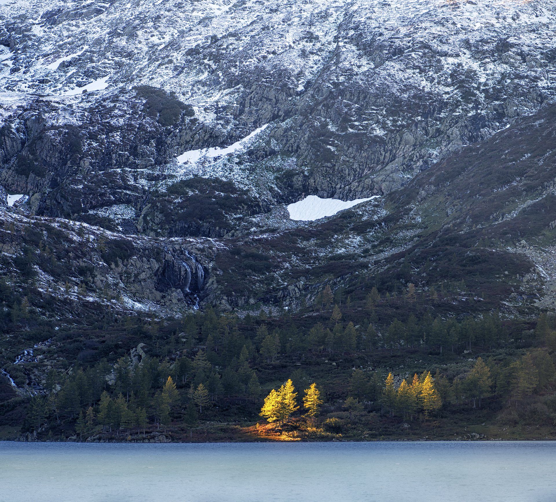 Подумал, что такие лучи характерны для середины сентября в этом месте. Солнце попадает при закате в "щель" между пиками и выборочно освещает несколько лиственниц. Главное, чтобы солнце было, а то в это время погода неустойчива... дожди...)