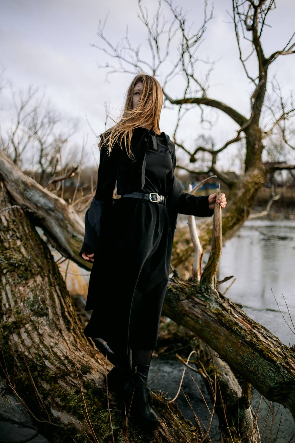 Настя на фоне мёртвых деревьев, воды, тумана — она не противостоит этому пейзажу, а растворяется в нём.