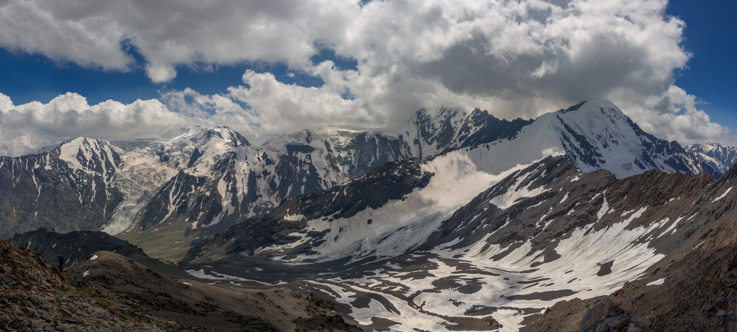 Кармадонское ущелье, справа перевал Цата (3900м), гора Шаухох (4636м), Джимарайхох (4598м), Майлихох (4780м), за облаками спрятался Казбек, снимок сделан с пика Геодезиста (4070м), Осетия...