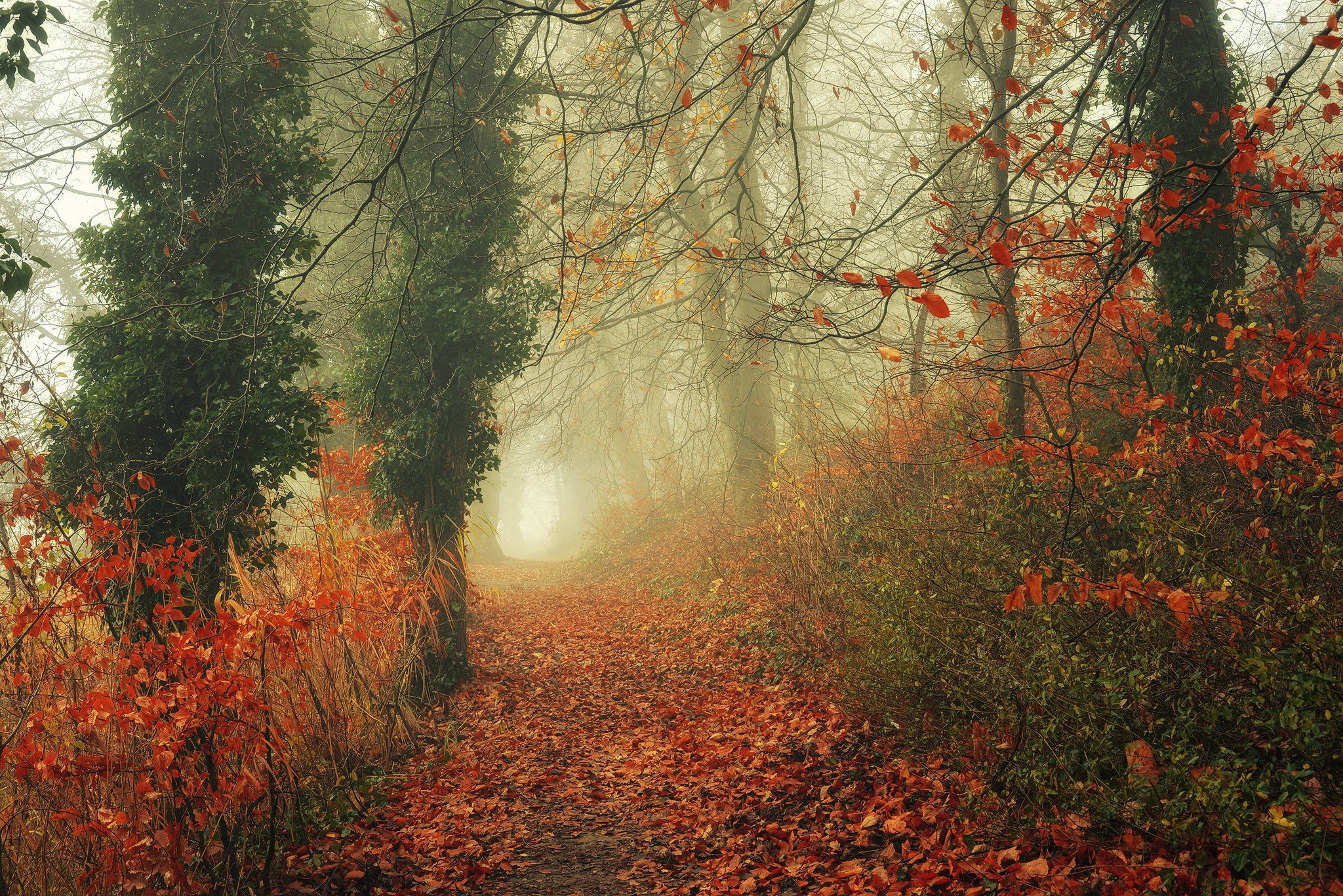 осенняя тропа autumn path misty fall trees magic mist foggy road dranikowski leaves, Radoslaw Dranikowski