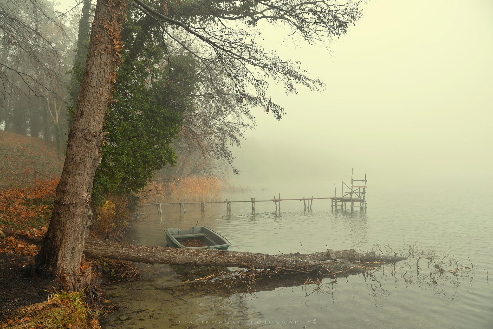 melancholy at the lake тоска по озеру water foggy morning mist magic dranikowski лодка boat tree, Radoslaw Dranikowski
