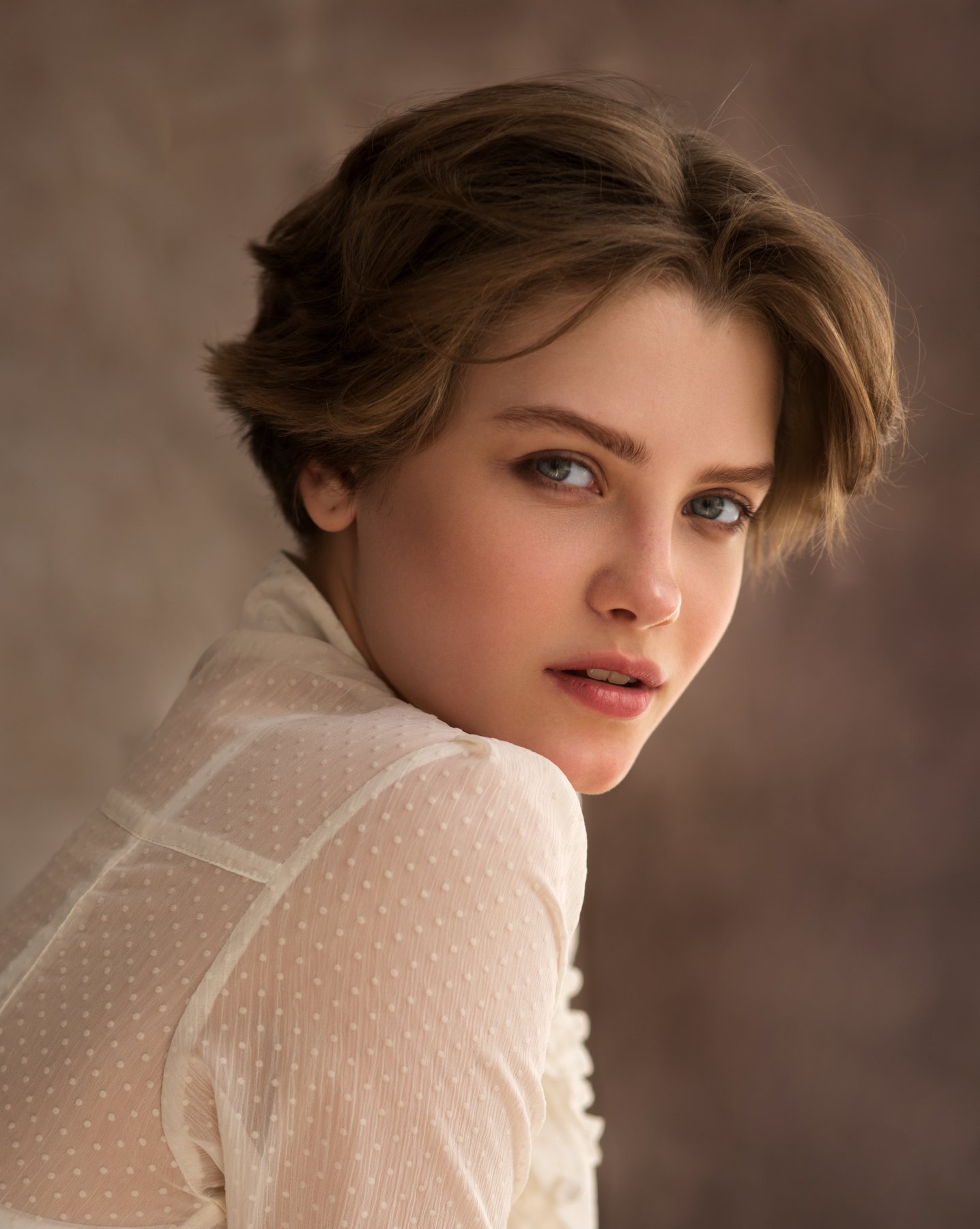 В кадре — не просто лицо, а история. Полина, в белом полупрозрачном платье, оборачивается с лёгкой задержкой, будто вспоминая, что оставила за спиной. Её взгляд — пронзительный, но не требовательный, как будто она смотрит сквозь зрителя, в то, что за ним. Свет мягко обволакивает, подчёркивая текстуру ткани и тонкость черт. Это не снимок — это мгновение, застывшее в тишине. Фотограф Денис Дрожжин мастерски уловил ту самую незаметную драму, что живёт в каждом взгляде.
