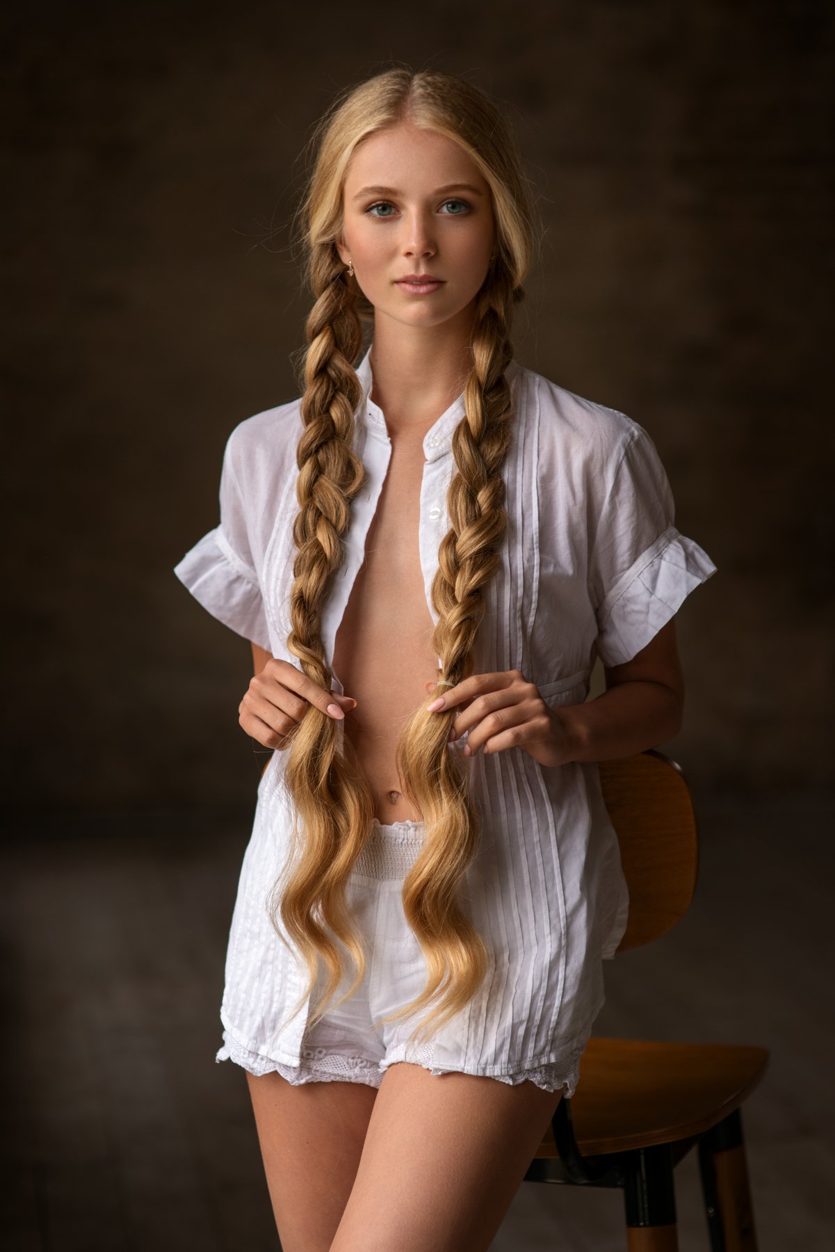 На снимке — молодая женщина с длинными, аккуратно заплетенными косами, одетая в свободную белую рубашку и шорты. Она сидит на деревянном стуле, слегка наклонившись вперед, и держит концы кос в руках. Фон — темная, нейтральная стена, что подчеркивает светлые волосы и одежду. Освещение мягкое, студийное, акцентирует черты лица и текстуру волос. Снимок передает спокойствие и естественность, характерные для портретной фотографии. Автор — Денис Дрожжин.