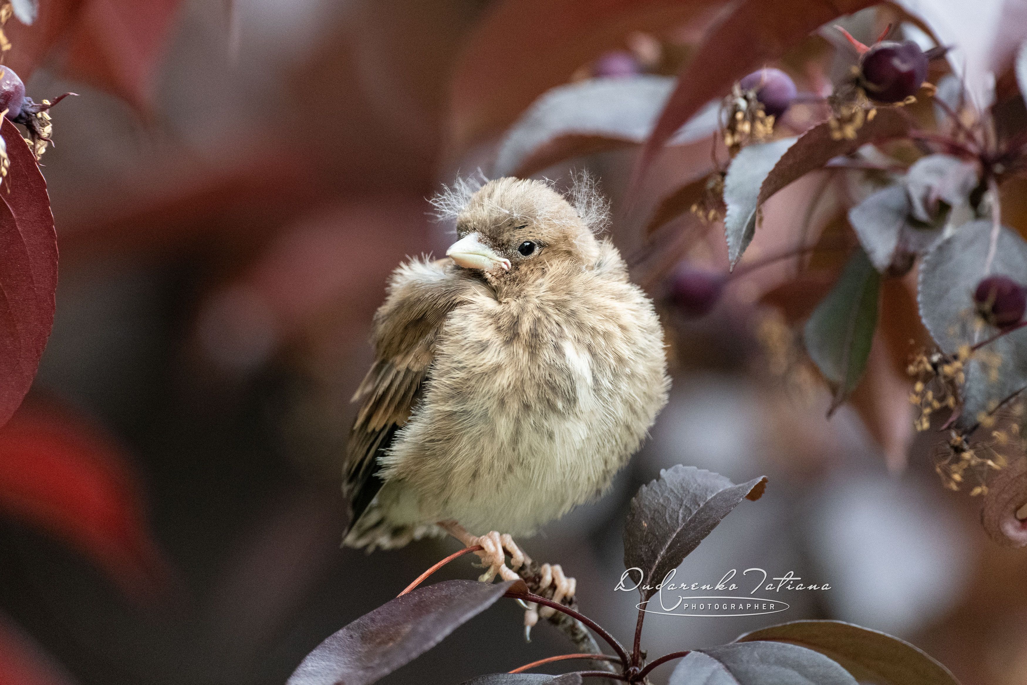 Эту певчую птичку - коноплянку, я и раньше видела, но юркая пернатая успевала ускользнуть из моего фокуса. Недаром эта птица из семейства вьюрковых. Но сегодня я нашла ее «слабое звено». Маленький птенец коноплянки с забавной "прической", недавно слетевший с гнезда, сидел на ветке дикой яблони, в ожидании корма. Взрослые птицы долго не прилетали. Я уже хотела покинуть мой наблюдательный пункт, думая, что птицы из-за меня опасаются подлетать к птенцу, но пернатые оказались находчивыми. Они позвали малыша свистом и птенец вспорхнул навстречу родителям.