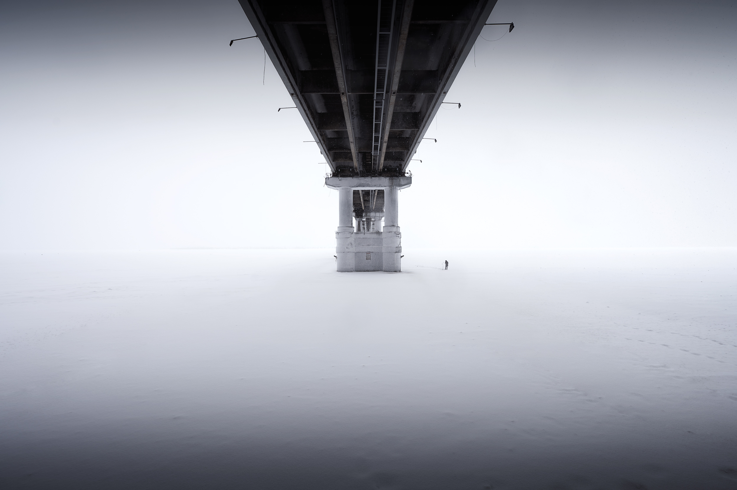 Сергей, снимок сильный — композиция строгая, пространство ощущается как будто замерло. Под мостом — почти абстрактная пустота, и человек вдалеке создаёт масштаб. Всё чётко, минималистично.