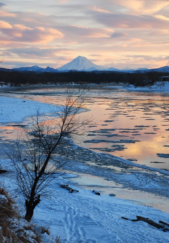 вулкан, закат, камчатка, река, отражение, облака, небо, Дмитрий Яровенко
