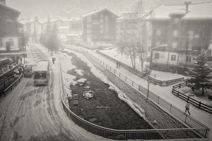 швейцария, город, церматт, река, дом, здание, зима, метель, дорога, улица, автобус, прохожий, горы, снег, мороз, dyadyavasya, Дмитрий Шамин